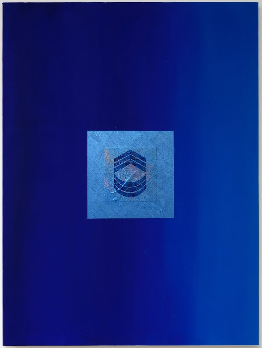 “The world is not monochromatic,” Billy Al Bengston reminds me, telling me why he won’t make another blue painting anytime soon. We are sitting at a table inside VENUS Over Manhattan gallery, where Bengston, who lives in Los Angeles, has an exhibition of both recent and historic paintings. The recent work is a series of monochromatic blue paintings which incorporate the chevron — a symbol he has been utilizing on and off since the 1960s.