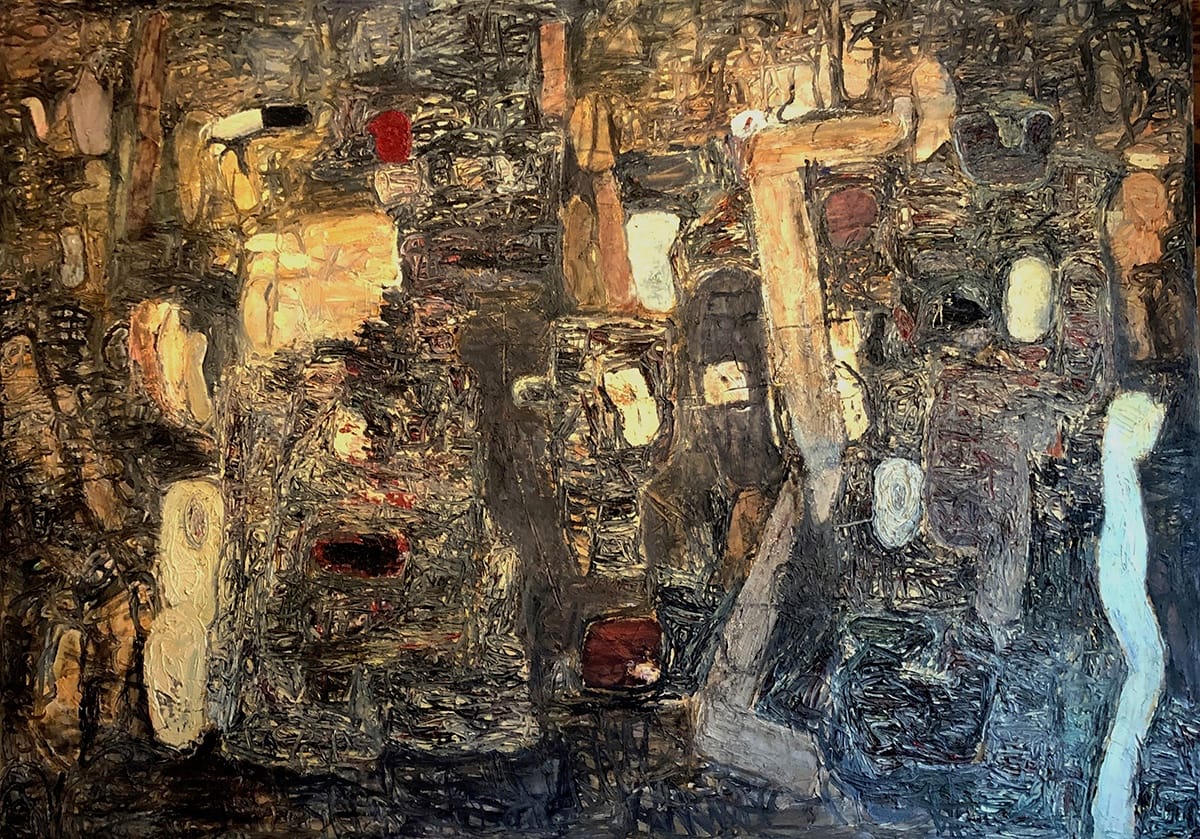 I used to go to FOOD, the artist restaurant in Soho. I had an “office” at the first table by the window. One day I brought some 6 x 8-inch index cards with me and just started doing scribbles – automatic writing. I saw shapes in them, and I started pulling them out as forms to work with. It was so free, compared to the tight surrealist painting I was doing. It took me into a whole new place. I did several small paintings, and then 36 x 50-inch paper pieces in oil, and then bigger paintings. It was very exciting to me.