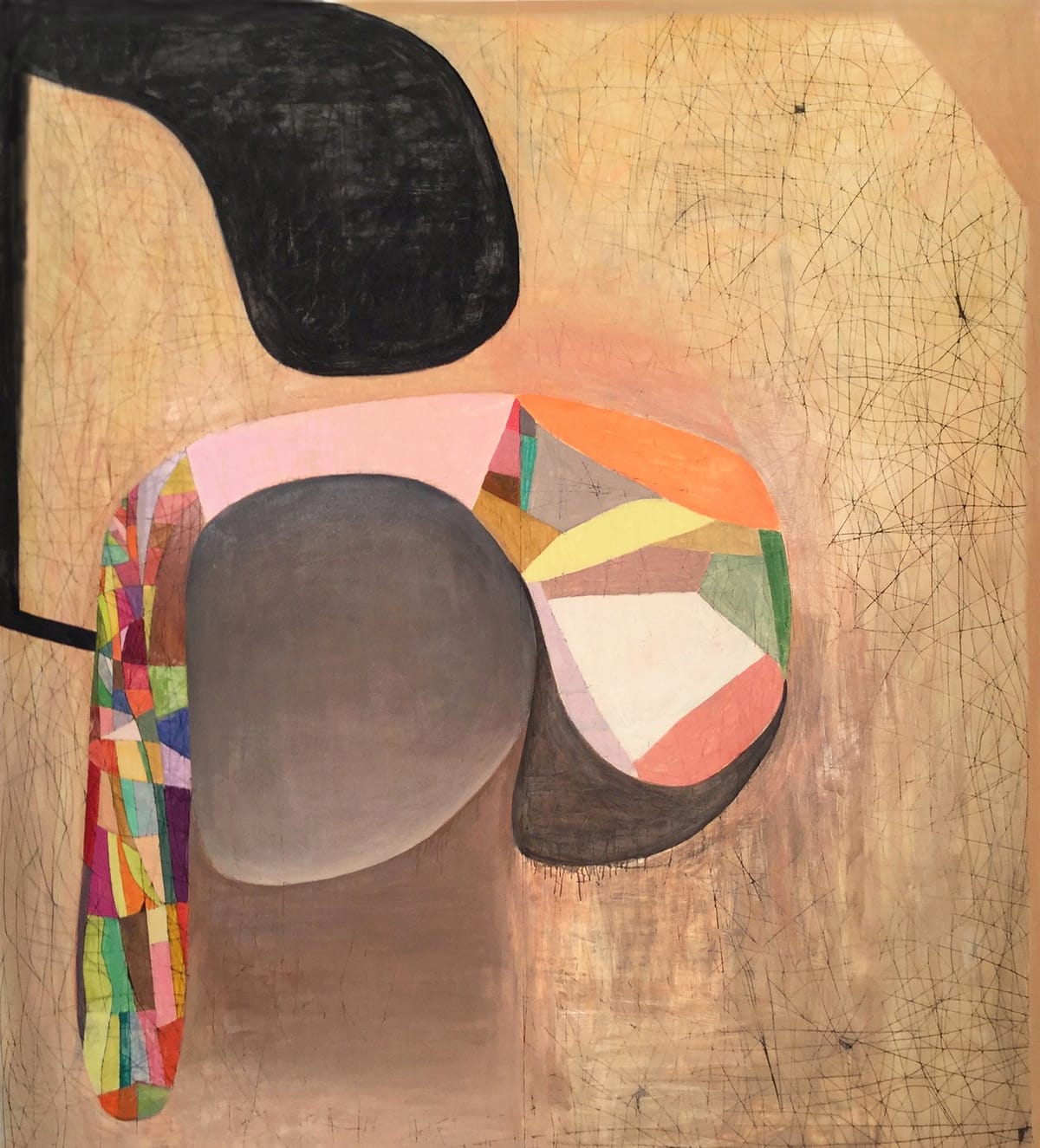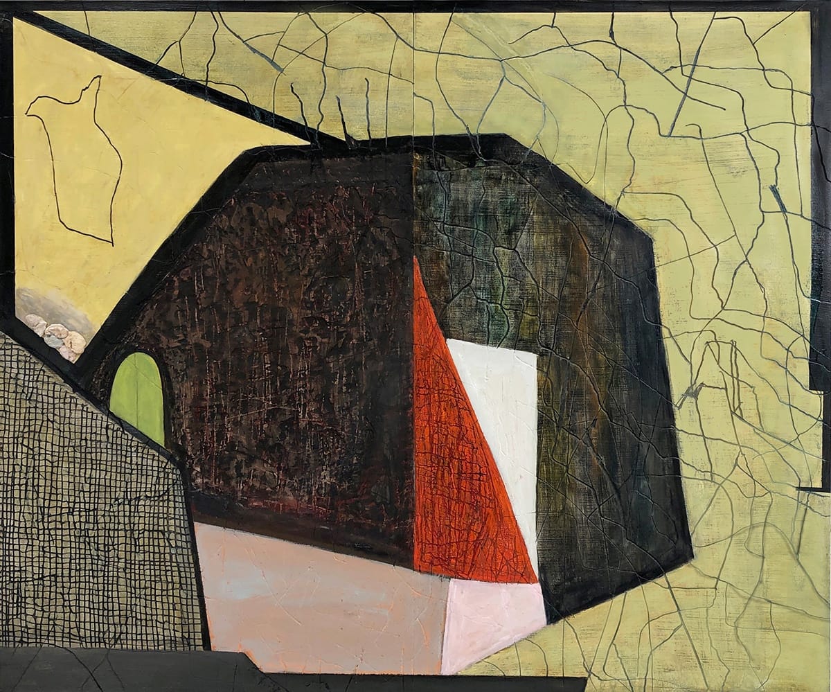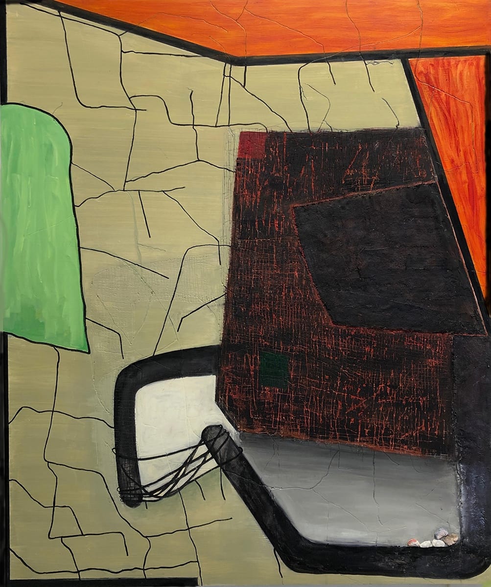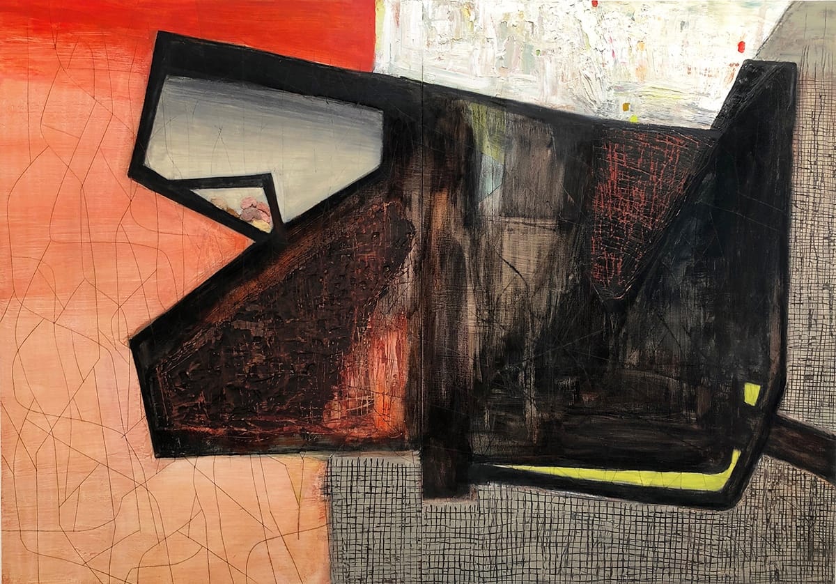 There are a few exceptions. When I was making the painting, “Impending,” (2018), I was listening to the news, and it got in my head that a large black shape in the painting represented Trump. Towards the end of working on the painting, I added a gray ball shape. There was also a curving form that some people considered figural. Once I added the gray ball, I saw the curved form as embracing and protecting the ball. So, it had a particular meaning. However, generally, there is not a narrative in the work any longer, or hardly any.