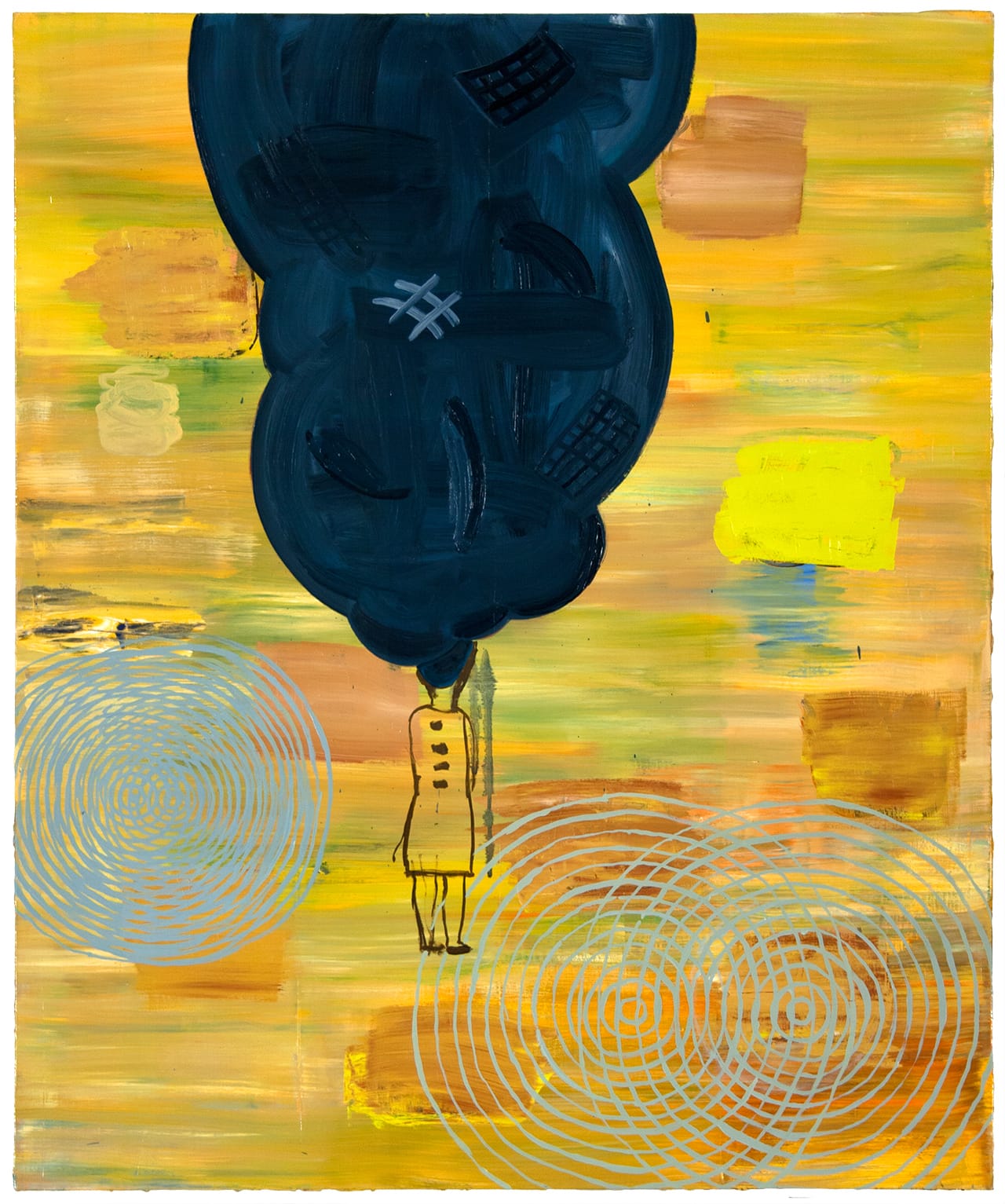 Yuen has a pleasantly self-deprecating sense of humor, which comes through in the work. The mid-size to large-scale paintings defy a single stylistic category. Instead, they mix aspects of OpArt, Surrealism, Persian miniatures, and Asian decorative linear grounds. Characters ranging from interspecies creatures to societal types are rendered in a manner that evokes both satirical cartoons and self-taught drawing. Although Yuen examines indisputably existentialist subject matter (figures dragging abstracted burdens through space, women laden with oversize collars and hairdos), his paint handling is never overwrought. Viscous, painterly passages occupy large areas of the compositions, with succinct, freely drawn images floating in space. Exaggerated scale shifts take the paintings away from coherent narrative into the suggestion of a subconscious, dream-like state.