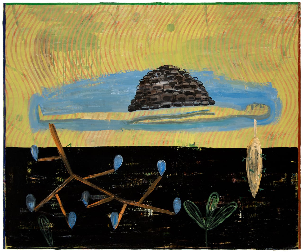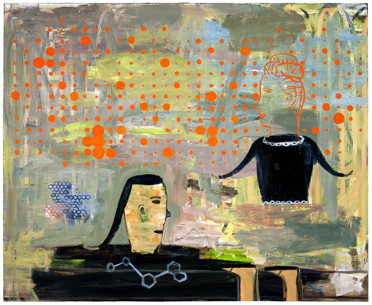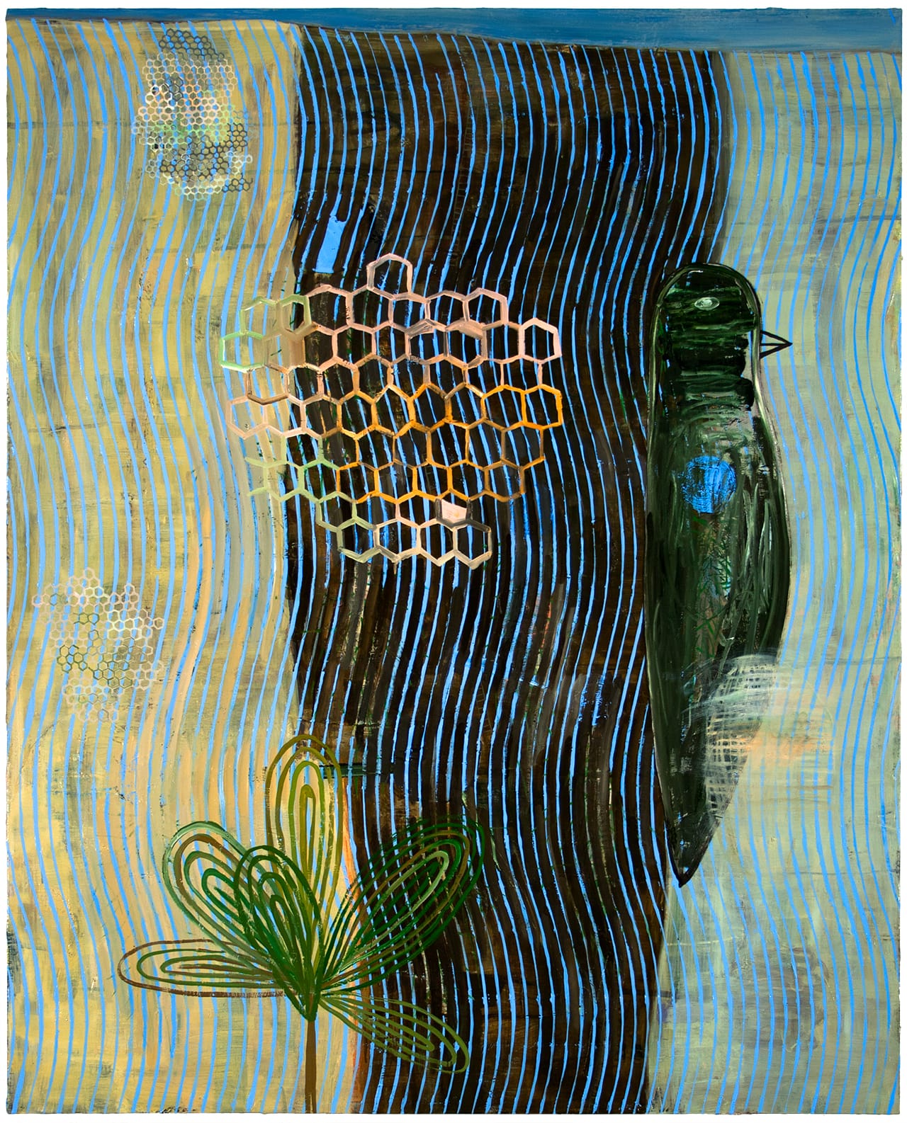 The beehive is another character. Bees are endangered now, so there is a tragic aspect. The hives are kind of a metaphor for society, and they are also related to molecular diagrams – hexagonal forms. They also provide the opportunity to paint different kinds of lines. I like to paint sinuous, free-form lines, as well as lines that are constrained and controlled, although painting a hive is kind of boring.