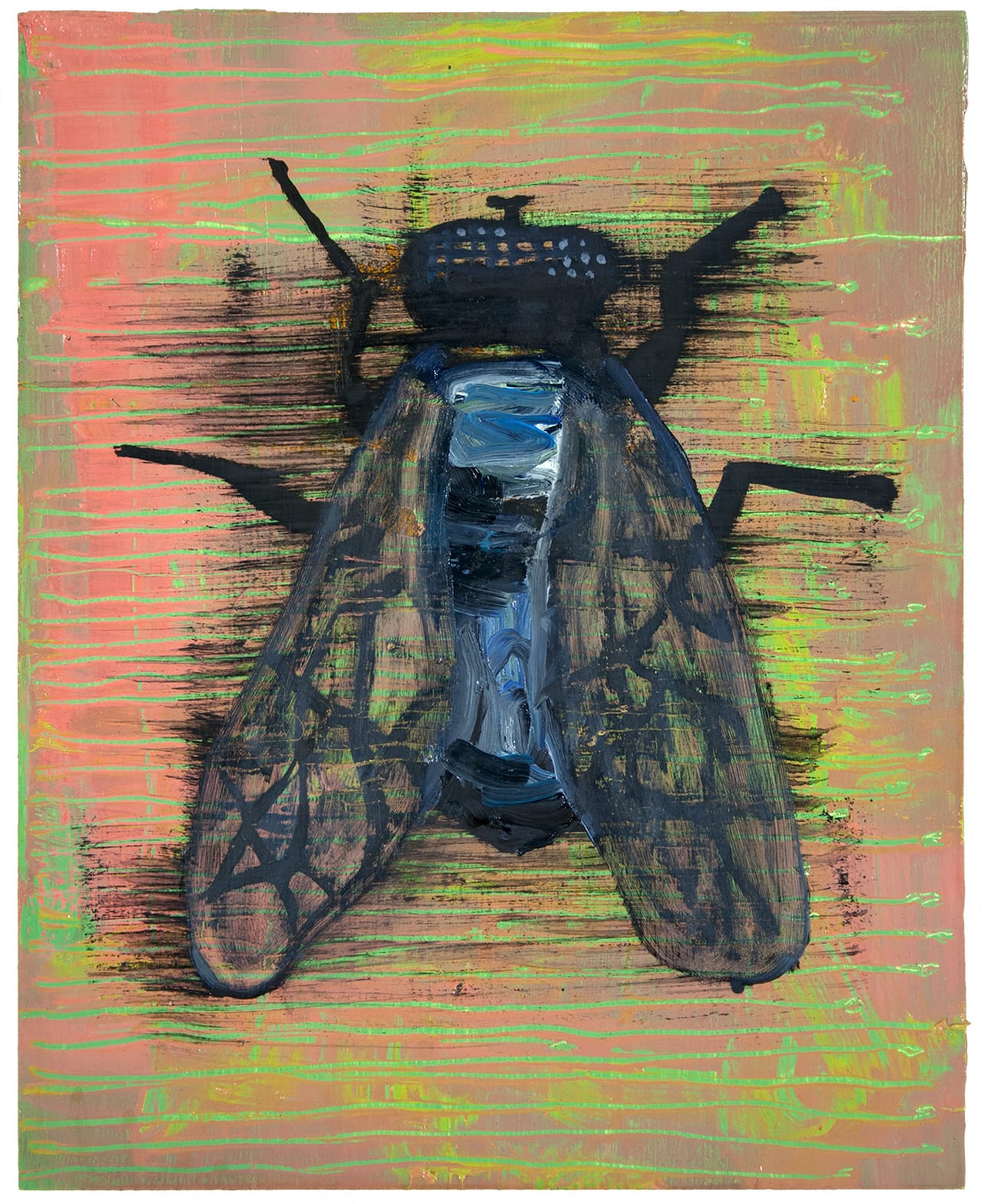 The fly is a newer character. That was about wanting to paint something disgusting. The fly is the underbelly. They are attracted to poop – gross! Everyone hates flies. I love the visceral-ness of it. On a formal level, I also loved how I can work my linear patterning into it, along with the shapes. You have two events in a fly: the wings, and the amazing eyes — those detailed little dots. If you are trying to pair concentrated, detailed areas off of broader, blank expanses, flies aren’t so bad either.