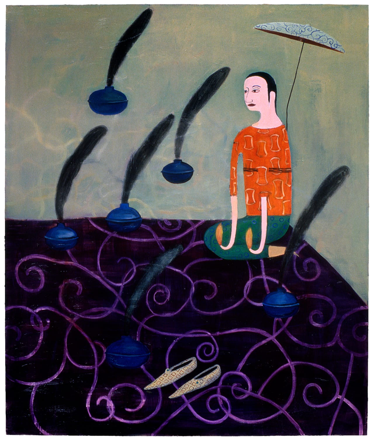 Another recurring character is the businessman, who shows up a lot. I poke fun at him. In a few paintings, his pants are around his ankles. In another, “The Polluter” (2003), he is peeing in the river. Not a whole lot of ambiguity there! However, I like to think that the compassion with which the businessman is painted helps to introduce some ambiguity. He is not just evil. He’s sort of embarrassed and looking over his shoulder. The businessman is “the man.” He represents normal society.