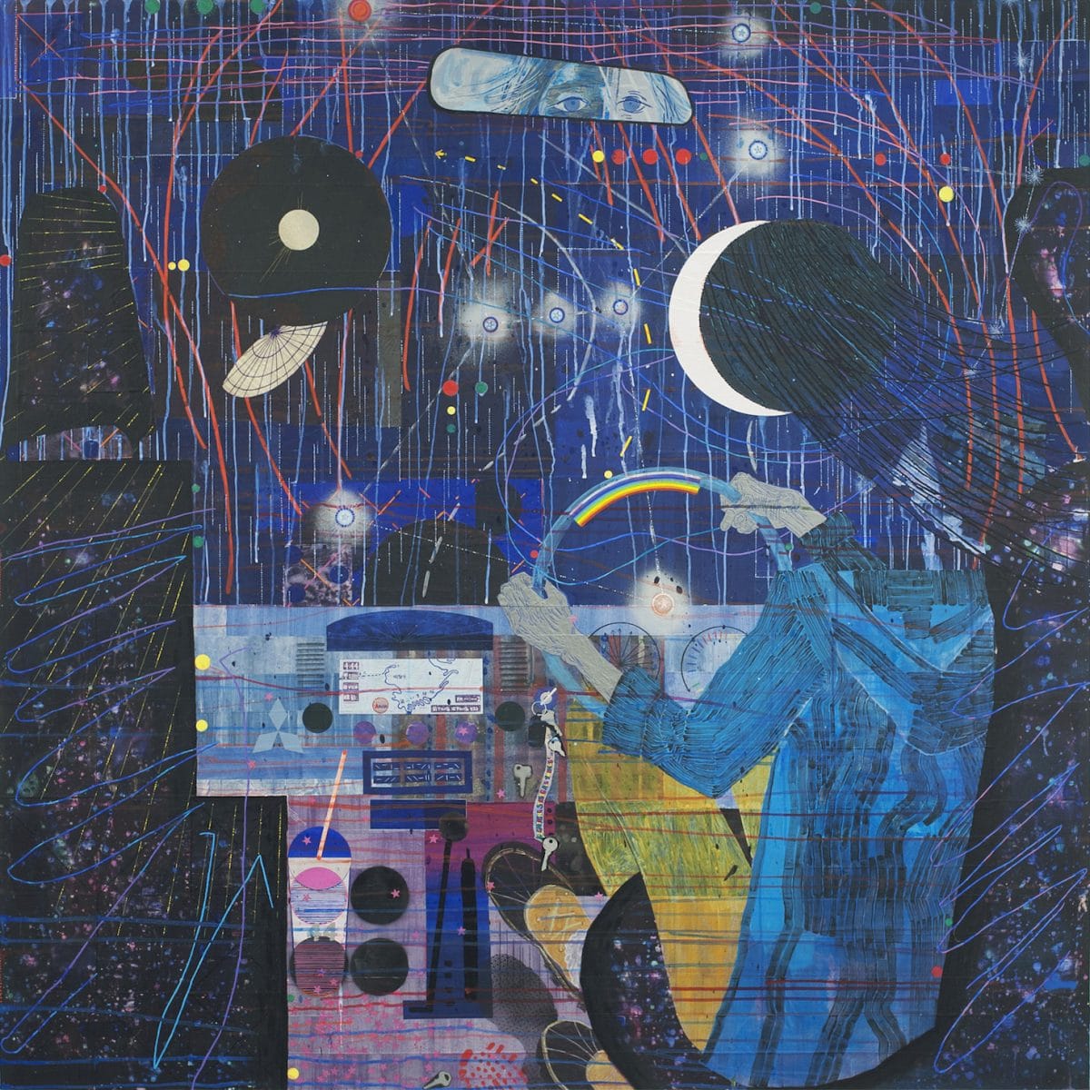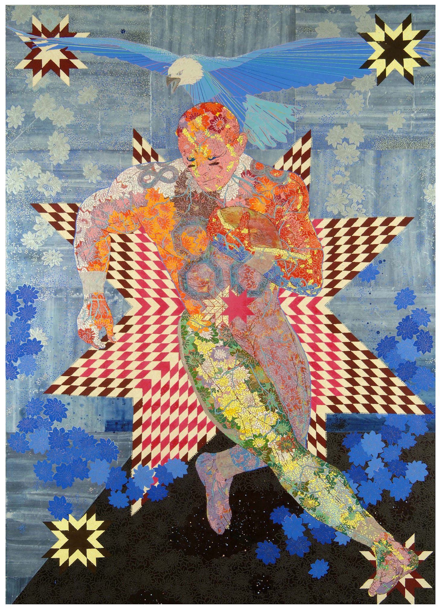 Fueki’s paintings, made by collaging cut and painted pieces of paper onto wood panels, are humming, pulsating nerve centers. Disparate signs and popular symbols, patterns and grids, bodybuilders and birds, shooting stars and skulls, all congregate into one synchronous vision, contained to the verge of bursting. Still, everything within them — and the overall painting — has a laser-sharp focus, as if the act of precise cutting has held it there.