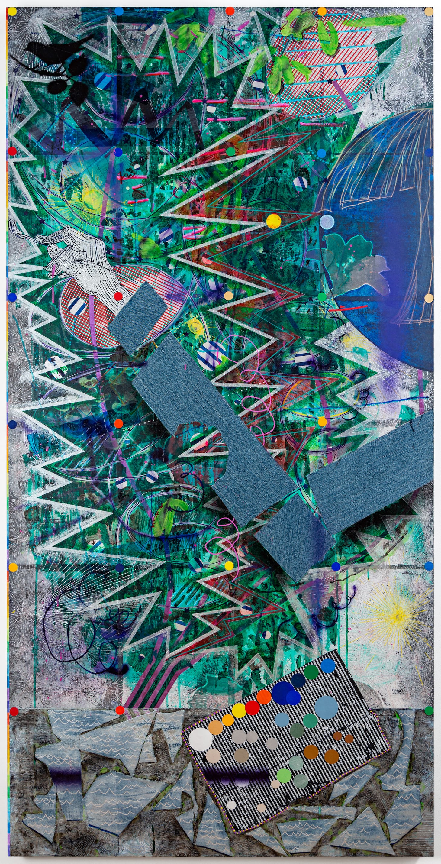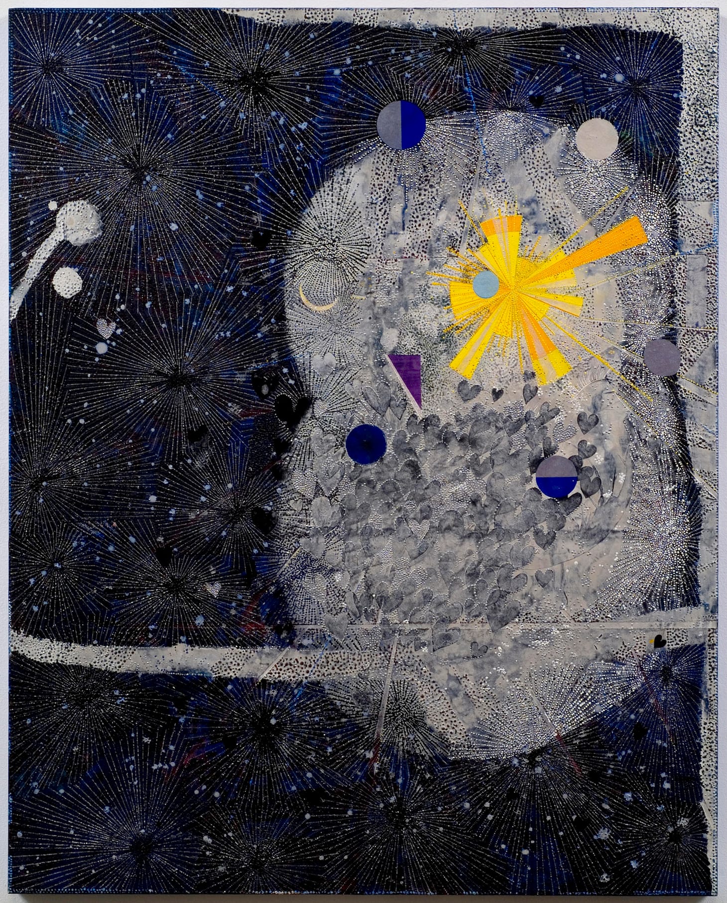My process has gradually grown more open and organic, with less hierarchy in the structure and more of an equivalence between mark, symbol, shape, spray paint, pour, dot, collaged paper, field, or drawn line. I think of these as all being woven into each other and signaling an “energy version” of who or what I am painting. They are imagining what it is like to be a living body on subatomic and cellular levels, while also interacting on a human scale. Most of the paintings are large in scale because I draw each shape in relation to my body, and hopefully a person will feel it with their body too.