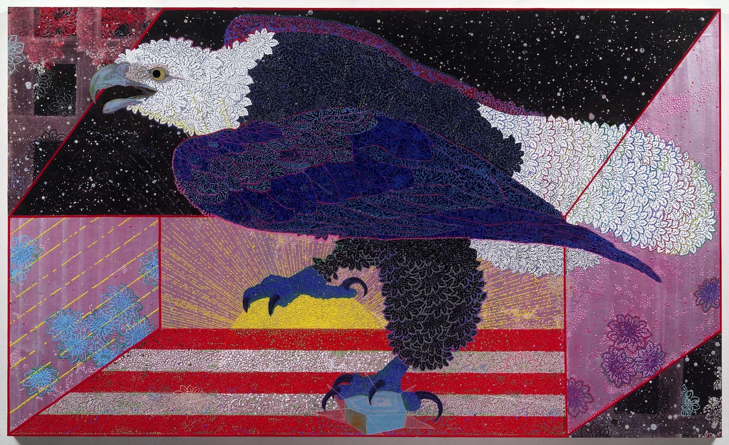 CF: The ground of many of my earlier paintings was made with graphite rubbings on mulberry paper from a plastic placemat’s raised chrysanthemum flower pattern. These densely packed chrysanthemums aggregated into larger shapes of symbolic imagery, from skulls to eagles to bodybuilders. The individual chrysanthemums were also an outer structure for an even smaller-scale language of dot patterns, so there was a nesting of micro within macro in those paintings.