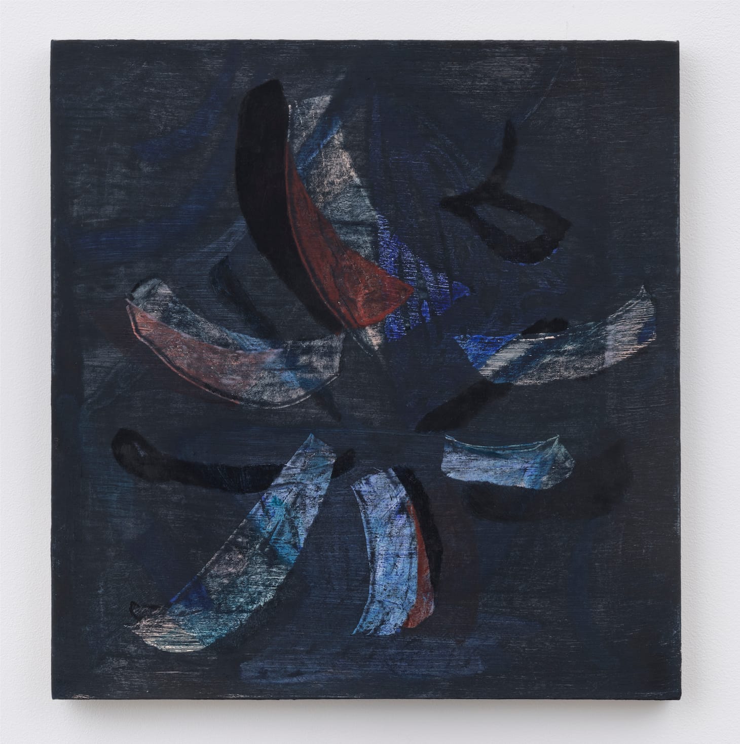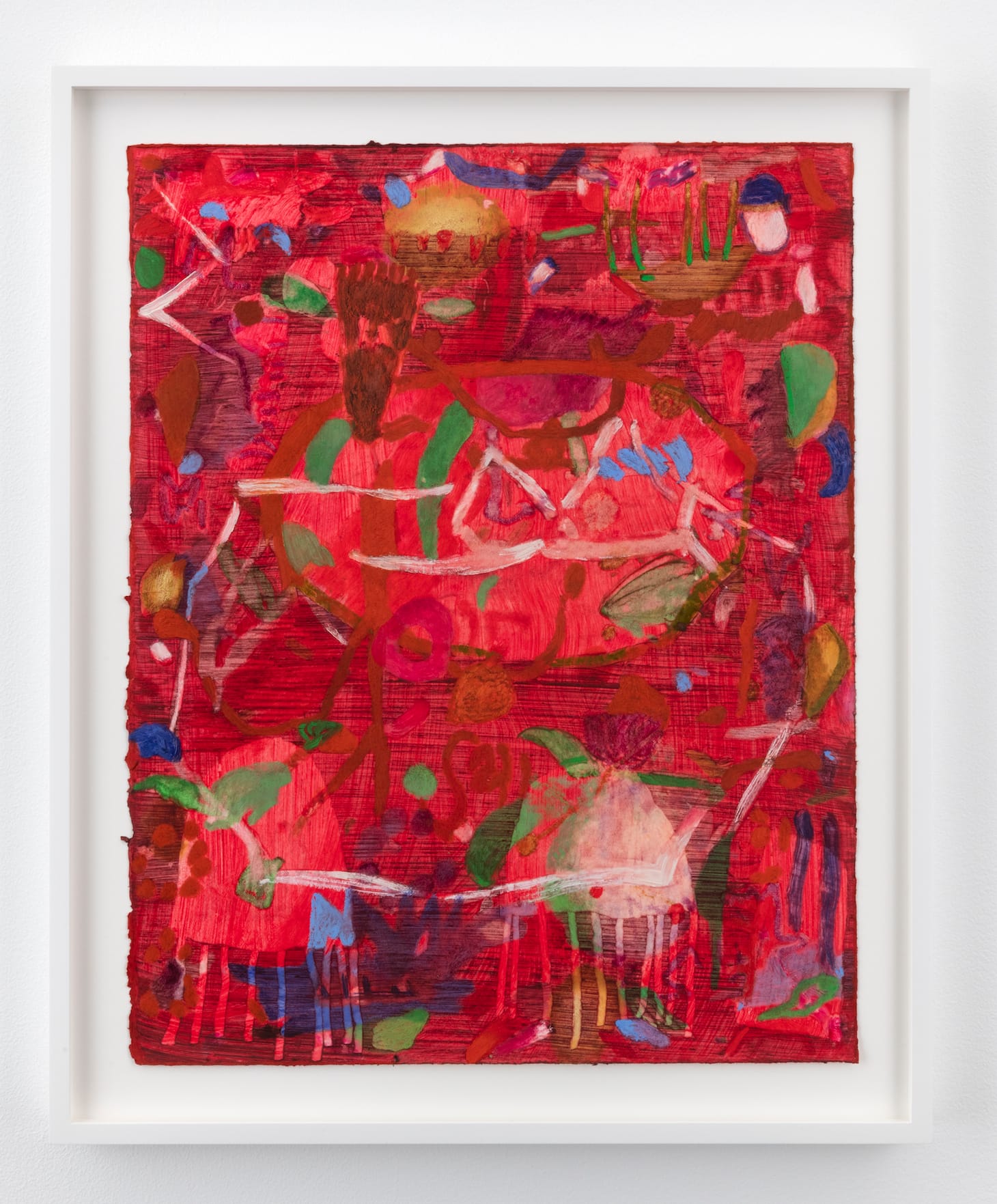 The poet and art critic John Ashbery wrote, in relation to painting, “most good things are tentative, or should be if they aren’t.” I think of this idea when I experience Clare Grill’s abstract paintings. I live with a 12 by 10-inch painting by Grill in my bedroom: “Horseshoe,” 2016. The colors range from deep pink to burgundy, and the forms, as the title suggests, all take off from a horseshoe shape, stretching into arcs and crescent moons across the surface, pulled by gravity into uneasy ovals. It is punctuated by a thin, pinkish border around some of the edge, suggesting a slightly asymmetrical wall hanging. A tactile range is packed into the small piece: it suggests red velvet, but it is also viscous, scratched into, and translucent. The marks are both considered and very aware.