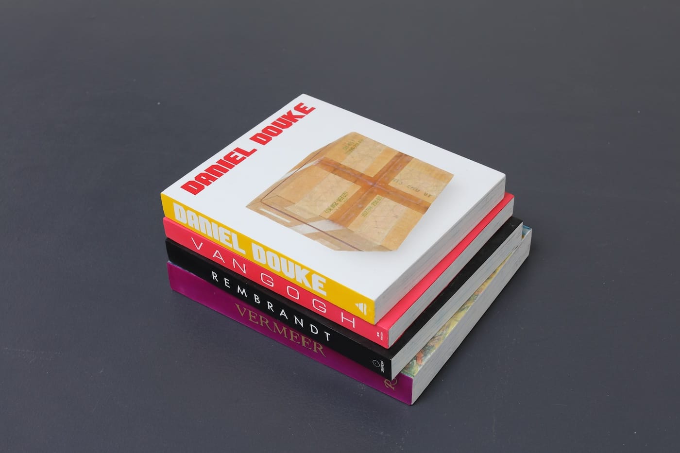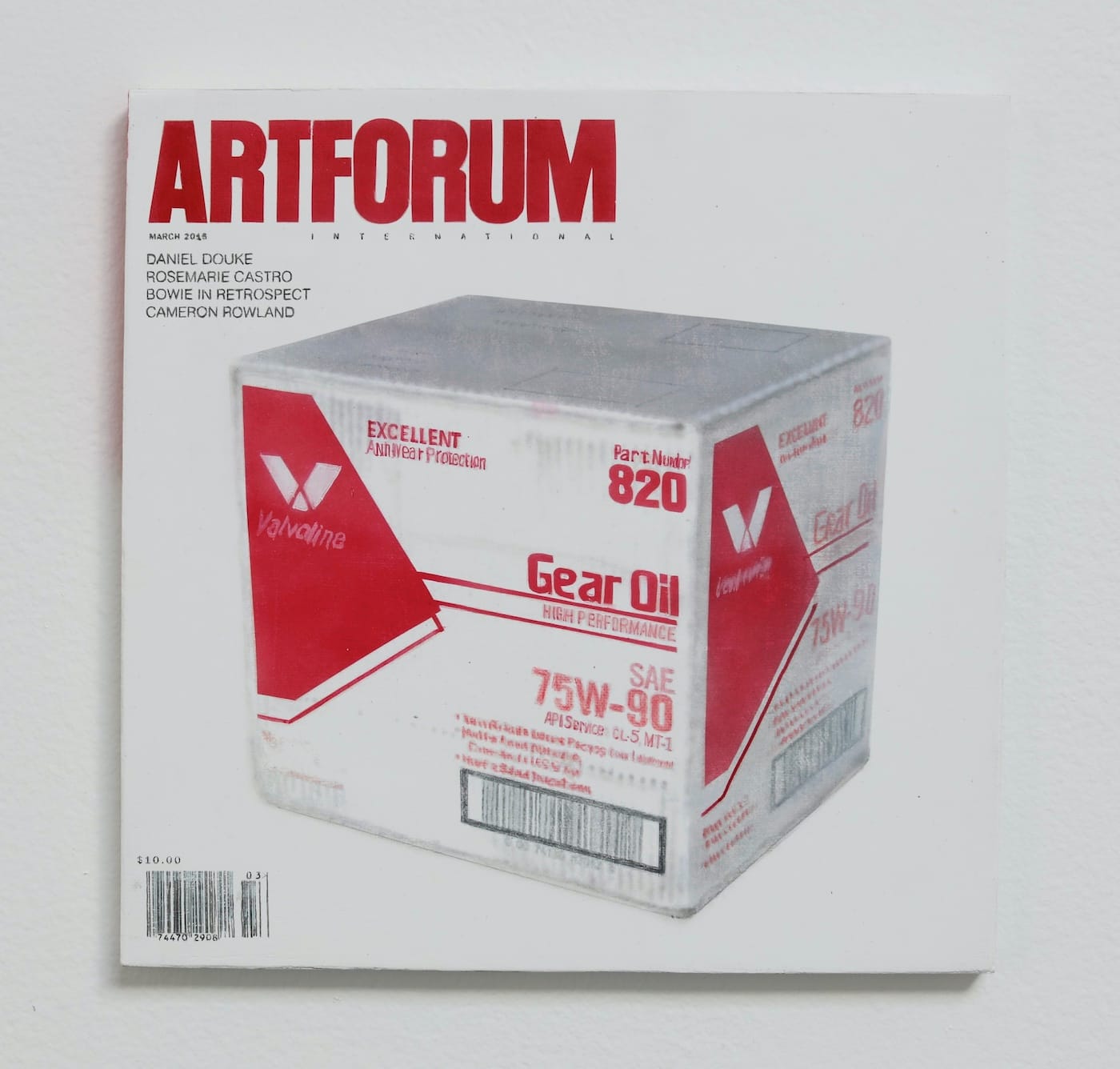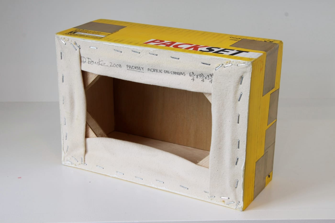 Douke first became known in the 1970s for his photorealist paintings of swimming pools, before turning to trompe l’oeil representations of scrap metal and used sheets of cardboard. Later, he began making dimensional paintings of everyday items — Apple computer boxes, street barricades, wood crates, and mailboxes, among others. The paintings are so thorough in their illusionism that they present, to viewers, as the actual objects. A glimpse of the backs reveals that they are painted canvases built out over wood panels and stretcher bars.