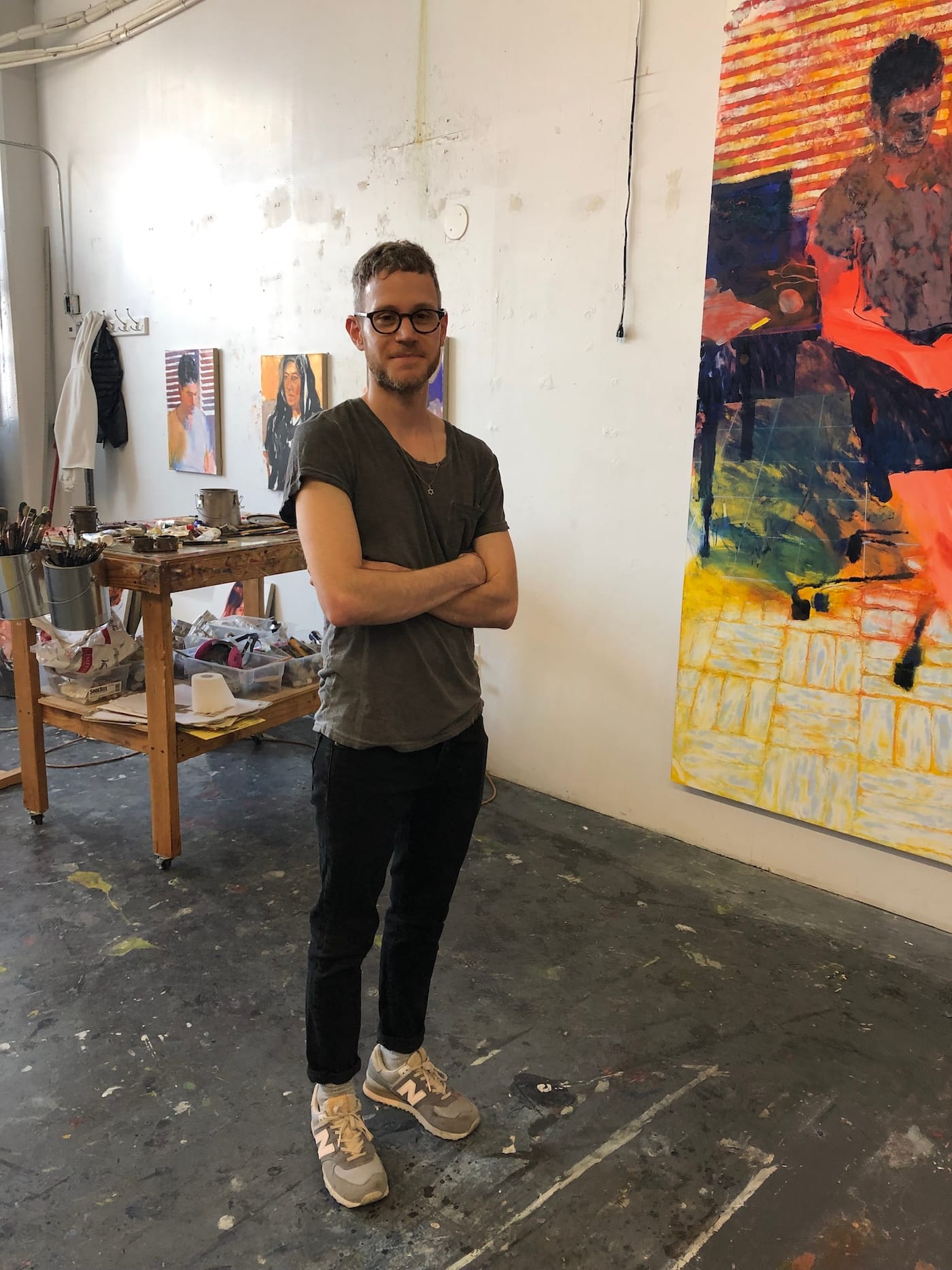 He, and his work, have a generous spirit. At the end of our conversation, he was eager to introduce me to his longtime studio-mate, Gaby Collins-Fernandez. He talks about his artist friends a lot, and it’s obvious that he takes pleasure in their successes. His 2018 solo exhibition at 1969 Gallery used a seductive and complex palette to draw us into an intimate world. His paintings orchestrate multiple figures, details of clothing, textiles, and interior patterns through a variety of textures and mark-making across the surface. He portrays friends, family, and his husband, and his affection for them is palpable. He lavishes the same kind of painterly love on his more explicit, queer sex paintings, and on what he calls his “dick portraits.”