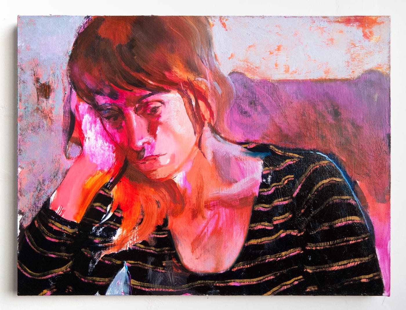 For every figure in the large paintings, I make a small portrait from observation where I can test out ideas about color and mood. The subjects sit just once for me, and I try to capture their likeness. Maybe this is old school, but I think that when I’m painting a friend, and it “looks” like them, it really means that it feels like them, or that it has their presence — which is what I’m after. That’s why I can only paint people I’m close to, because otherwise I won’t have that accesses to who they are.
