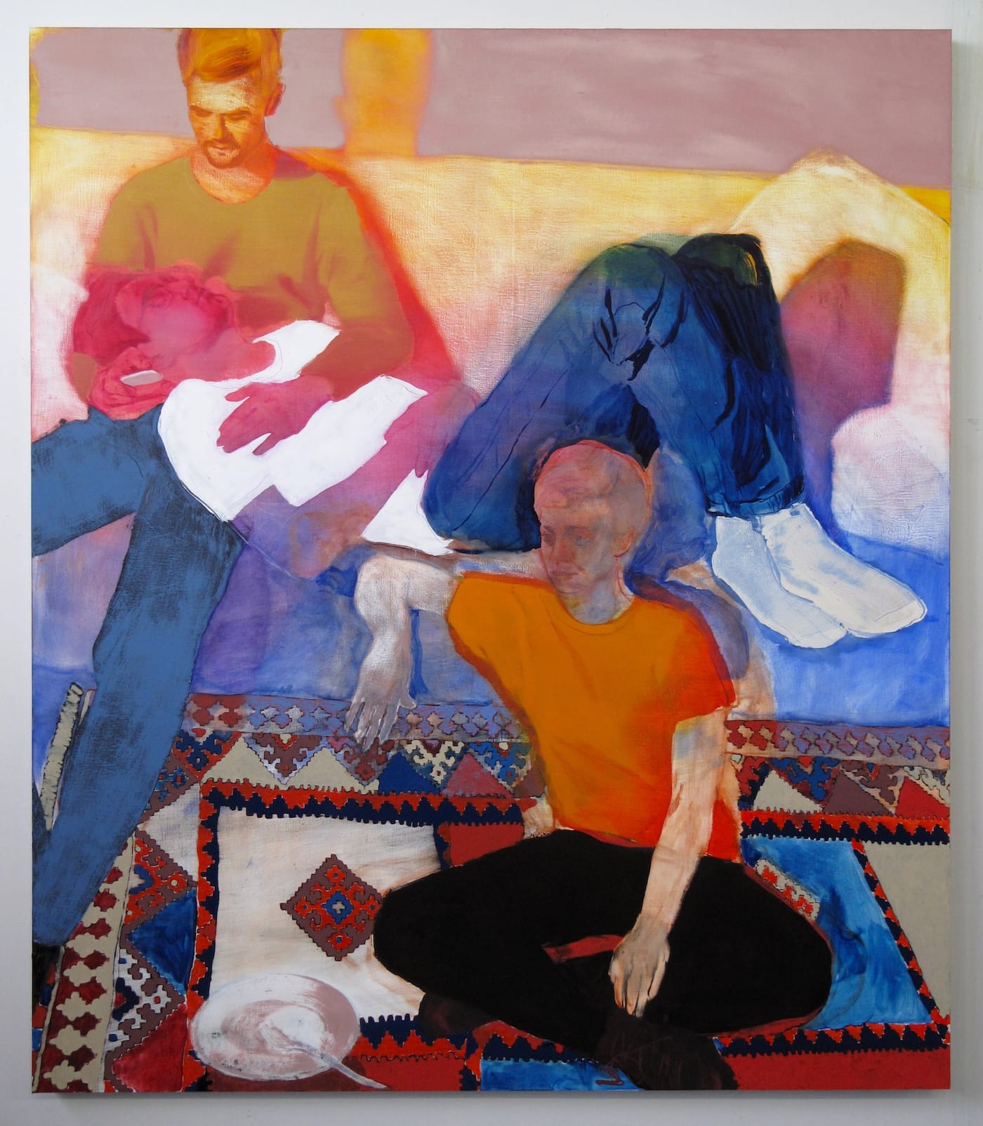 The large works start very loosely, by laying down large areas of color. I rely on the qualities of the pigment itself, such as transparency and opacity. I tend to use the same colors over and over again: magenta, Scarlet Lake, ultramarine blue, Prussian Blue, Indian yellow. The environments, which are half-invented or from photographs, build up over time and I add objects as I need them. The figures, sourced from the small observational portraits, start out as line drawings or shapes of color, and become more specific as the painting progresses. It’s a very responsive process. I don’t have an exact plan but I do have an idea of how I want the paintings to feel.