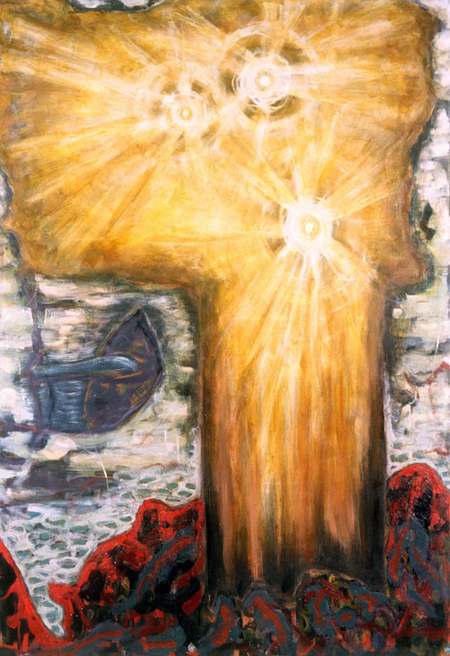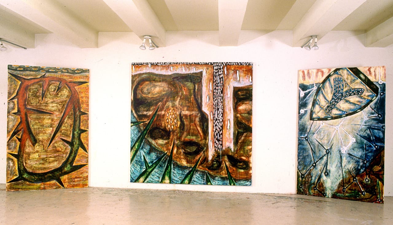 I also began using a more symbolic language. I gave some of the paintings biblical titles, in Spanish. I was thinking a lot about New Mexico — the culture and the churches. Father Friedhelm Mennekes, quite celebrated in the European art world, ran a “Kunsthalle” in a large Catholic church in Cologne. He saw my work and invited me to do an altarpiece project – a major triptych.