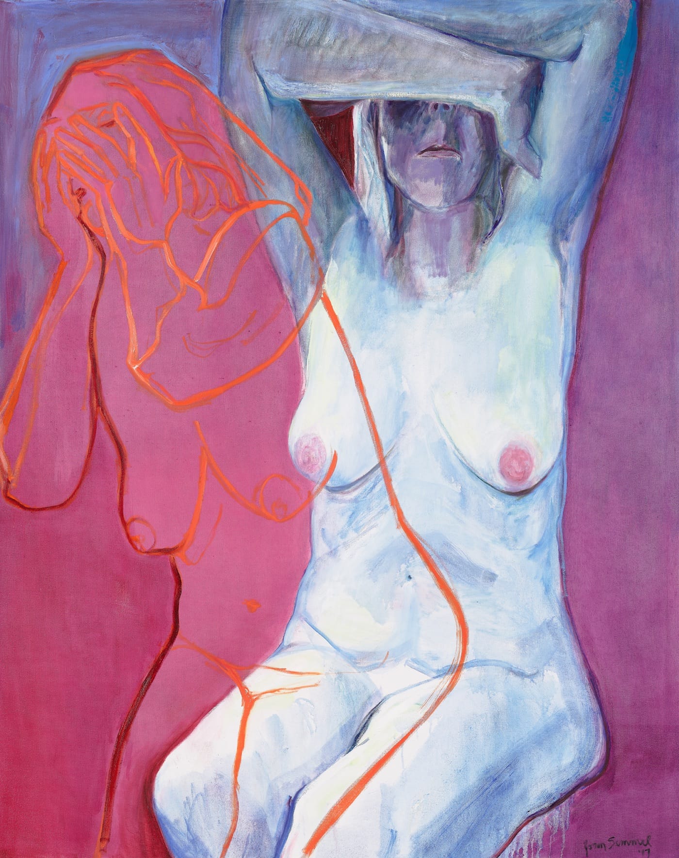 Semmel’s constant subject has been the “self-nude” — depicting her own body as she has aged, with a direct gaze that seems to lack vanity or the impulse to beautify. In her “Overlay” paintings, she doubled a realist image of the nude with gestural brush drawings of the same figure. The color and point-of-view of Semmel’s painting is compelling and odd and seductive. Figures are rendered in a realist hand but painted in sometimes lurid, sometimes ghostly oranges, gray-blues, greens, and yellows. Bodies become dune-scapes as the viewer is positioned in the artist’s perspective, looking down at herself.