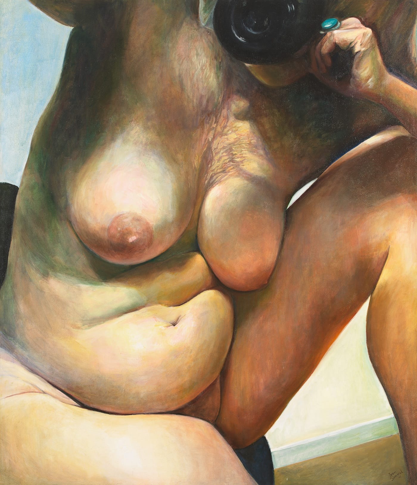 J. Semmel: I was interested in the narcissism that permeates the culture. When you walk into a gym or locker room, people are fixated on their own image and they barely talk or acknowledge one another. They are involved with themselves and the mirror. I went to a gym in SoHo where there were a lot of artists and dancers, so they knew me and I knew them, and I asked permission to take photographs. I took photographs in the mirror so the people weren’t posing. My reflection was in the photographs also, which led to a series of paintings of myself naked with the camera.