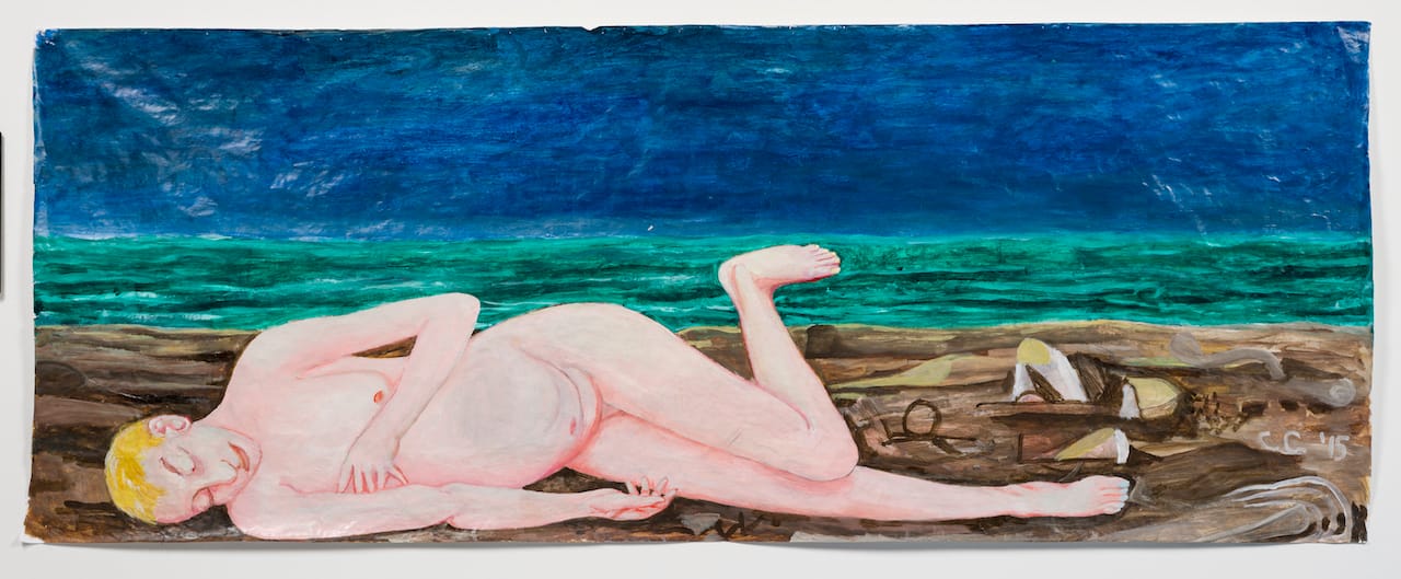 CG: The painting, “In Memoriam” (1999), was done from a memory of two very close friends: Louis Lunetta and Eddie Carrillo, who have died. We were staying at a forlorn hotel in Baja, Mexico. We traveled regularly to Mexico, once making our way from Mexico City down to Oaxaca, to Mérida and the Yucatán.