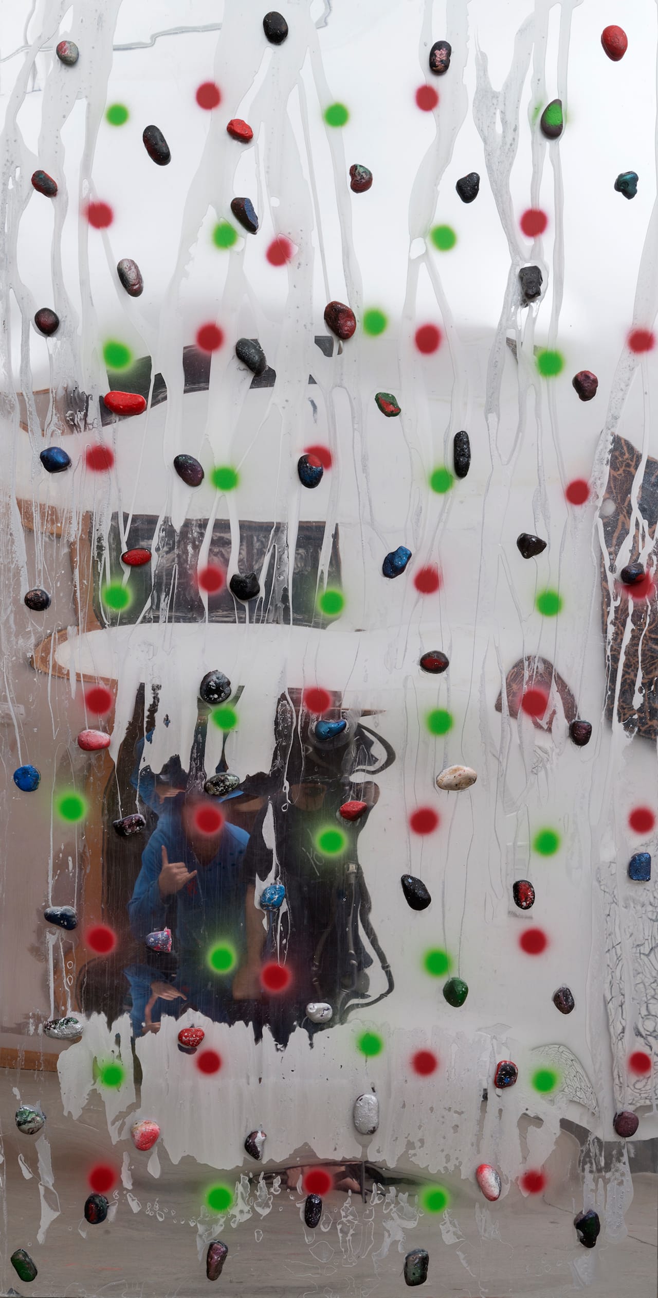 My mirror paintings are multi-panel pieces with mirrors covered in patterned shapes and physical elements, combined with craquelure paintings. The mirrors are bent and buckled, so when you look at them you have a bent view, showing these other walls and surfaces. The mirrors are covered with polka dots, funnel shapes, teardrops sprayed through stencils, or rocks collected from my garden, so that they do not just establish themselves as mirrors. The bending breaks the patterns on the mirror and shows other patterns, a whole world. Is that what’s on the other side? At first I liked the patches and pattern but they stole from the phenomena of these things. I am painting them all out now.