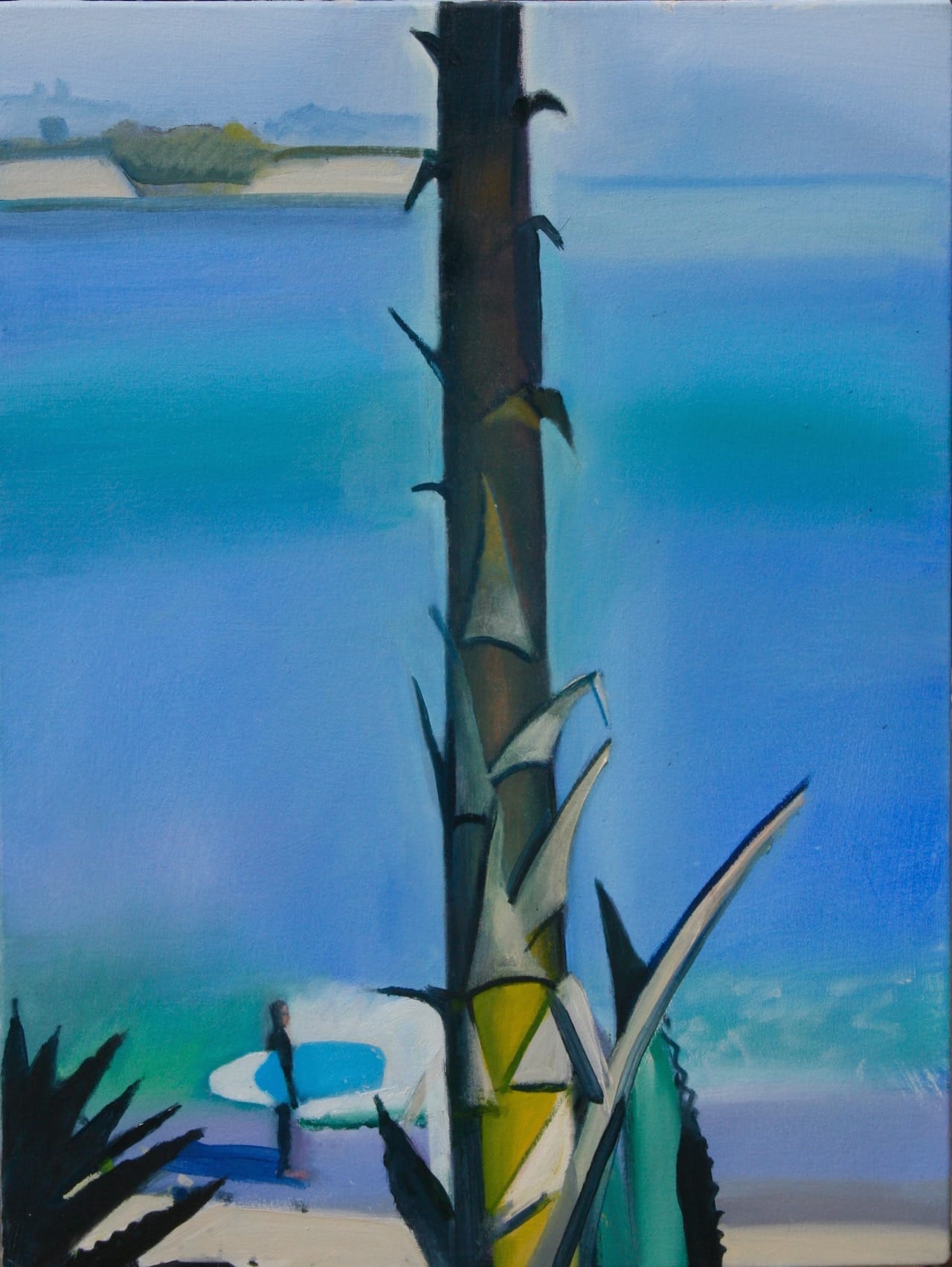 HP: At some point I realized, I am living in Santa Barbara, so why not work outside? Also, there is that Eugène Boudin quote:, “Two strokes in the field are worth two weeks in the studio.” In the field I often see something I could never make up – for instance, the painting of my older son, “Lincoln and Maguey” (2014). He came down to the beach with a new surfboard. I saw this yin-yang form: blue against the white, and white against the blue. I was out painting and he was standing there, and I thought, “Wow. That is perfect.”