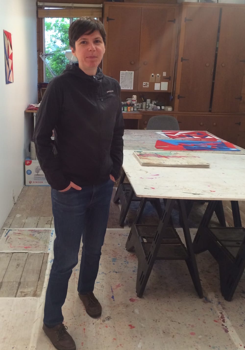 Her studio was set in the back of the house: an open room with a large worktable, cabinets, a few paintings in progress on the walls, and a paper-covered floor that was the site of a lot of painting activity. Dole-Recio makes abstract painted constructions: they are hybrids of painting and collage. Repeated geometric shapes form dynamic color compositions, and painterly moments punctuate them throughout. She utilizes cut shapes from older work, scraps, and residues of her painting process, recombining them with newer compositions. In a small back room were boxes of these elements: stencils and geometric paper shapes, half-covered in marks, lines, and drips.