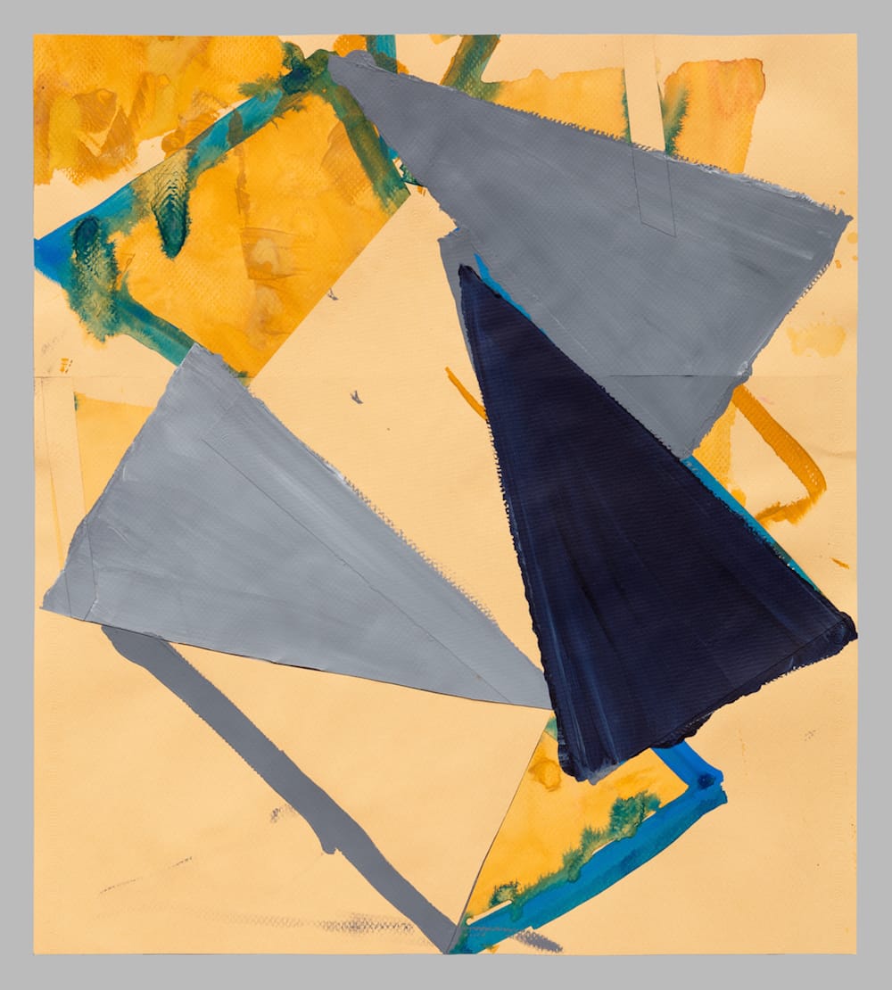 The current body of work is about responding to the color and marks that have accumulated on the brown paper protecting my studio floor – the five years’ worth of drips and smudges that end up there. I work on the floor and make stencils, so they are not completely incidental marks — it is like a net that I have cast. I am taking that paper up from the floor and cutting it into shapes. Then I combine it with parts from other paintings. Those two things make something new.