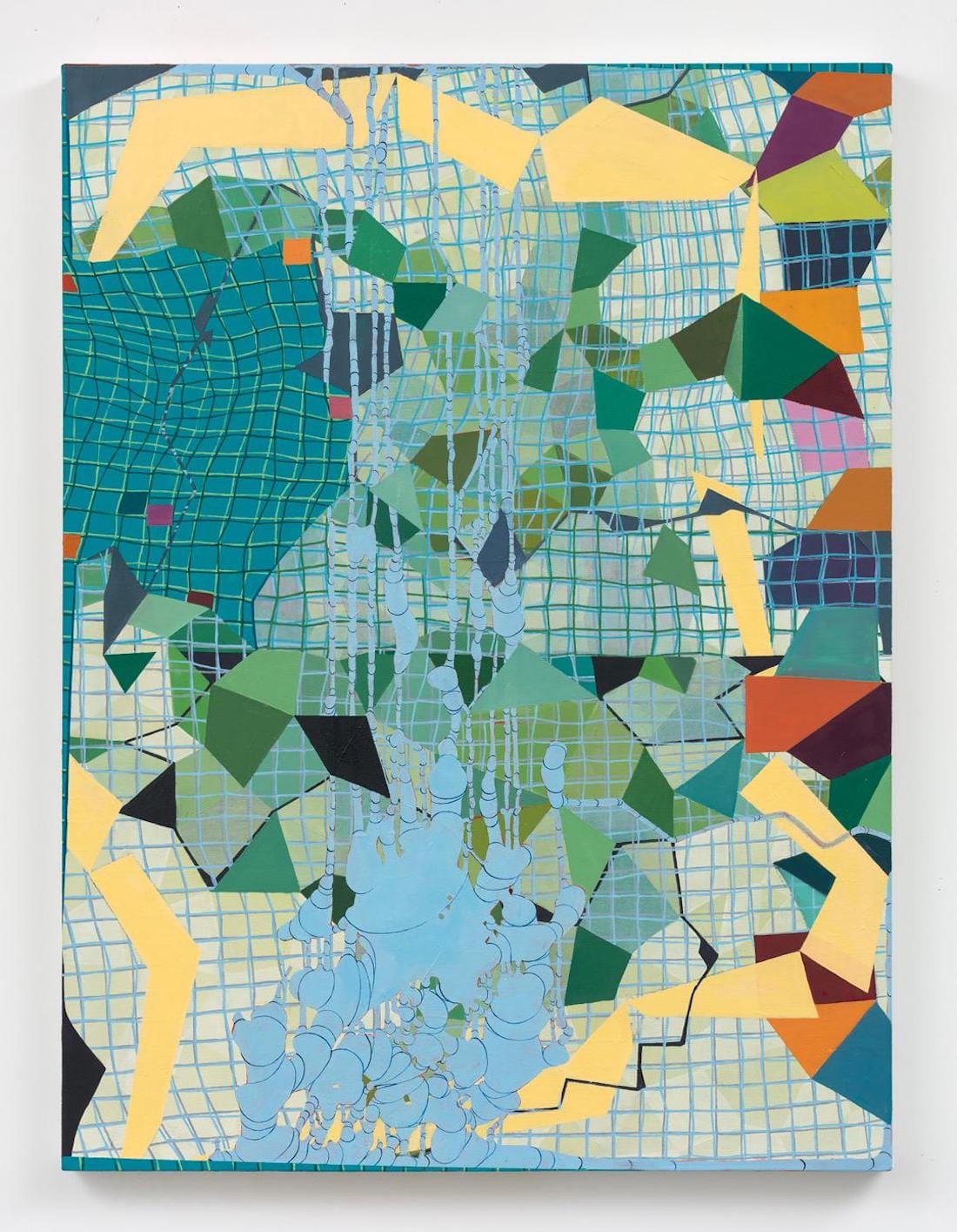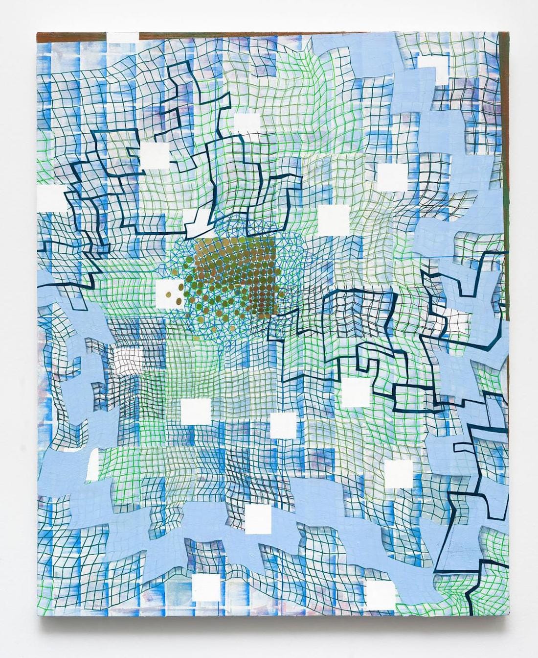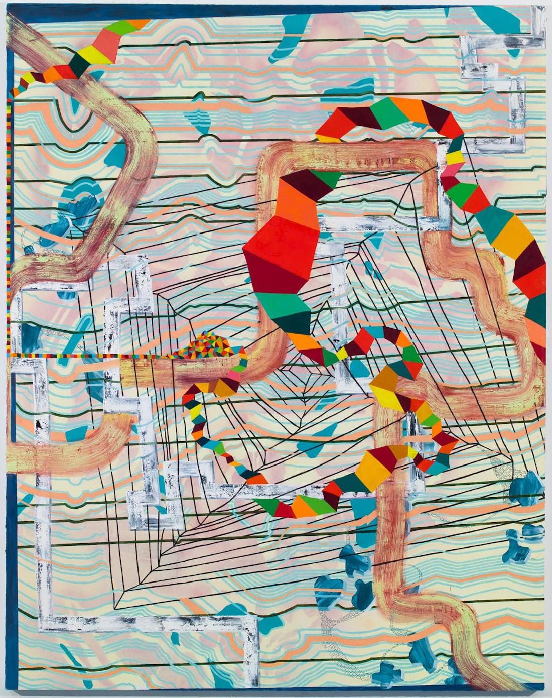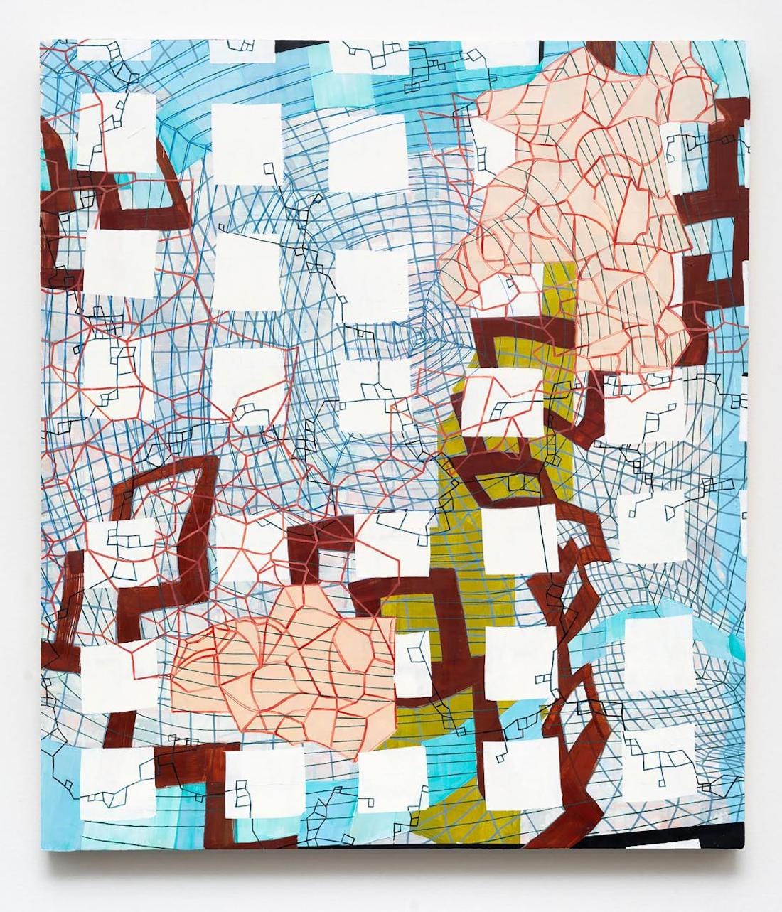 I never play by the rules. The grid is never really a grid. It is never measured right, or it might become web-like. I have never been able to fully understand the societal rules I’m supposed to be playing by. So all of the formal elements in the paintings are always a little bit off. There is something you expect about how they will behave, but then they start to do something that lets you off the hook.