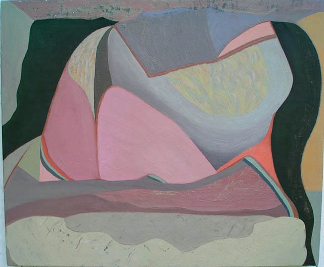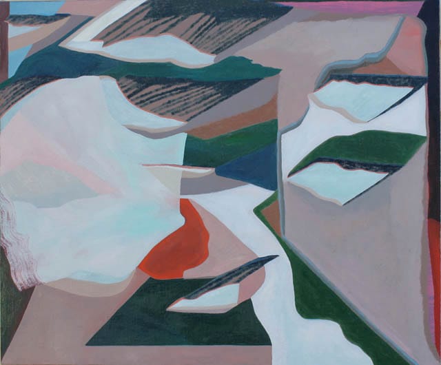 I draw a lot of my paintings with the end of my brush. Some of the drawing disappears as I paint. I have also started with certain colors. Lately I have been really into greens and pinks, and how they work alongside other colors and different whites. I am very affected by the environment, even though I don’t paint the environment directly. When we first moved to New Hampshire, I had a lot of fear of the woods and of getting lost here. Those anxieties get into your work. The paintings were darker.
