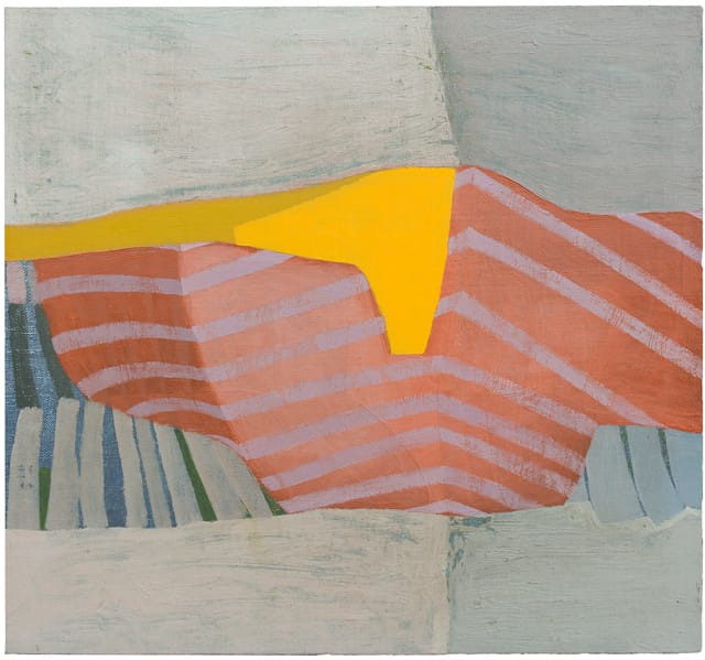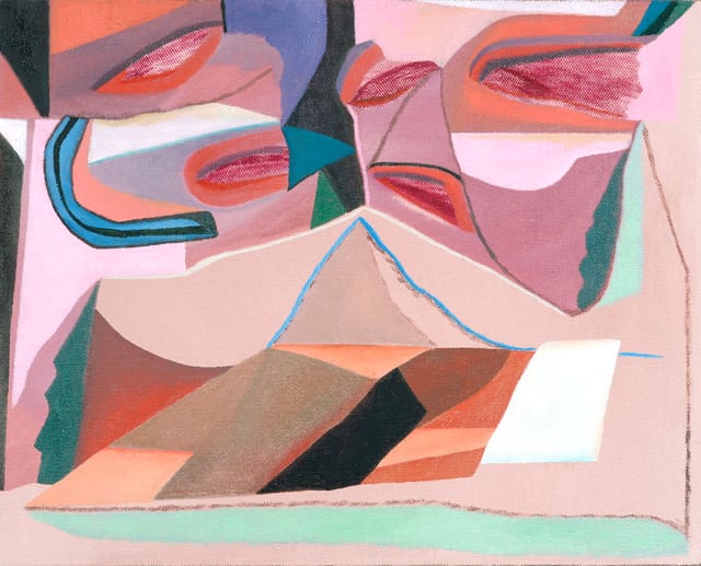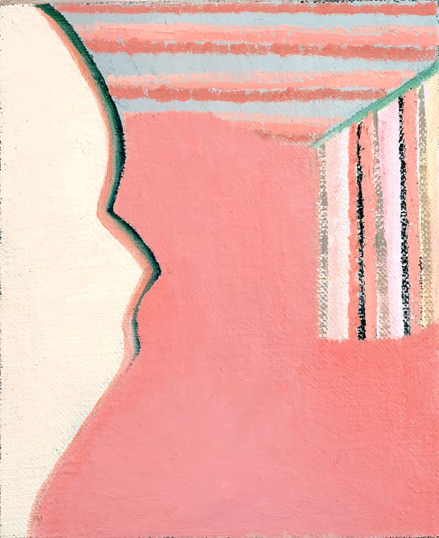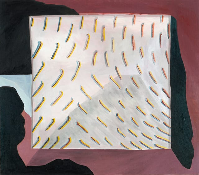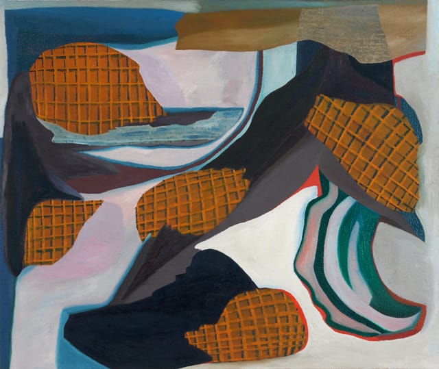 Covello’s paintings are compact abstractions, in which distinct forms, patterns, and shapes press urgently into each other. The forms are vying for space, but also integrated — like family in the midst of a creative working life. The juxtapositions and color chords are strange, evocative, and sometimes jarring. Although her paintings each carry an overarching mood, they feel like an abstract translation of moving through environments, where a host of associations, memories and daily obligations are ever-present.