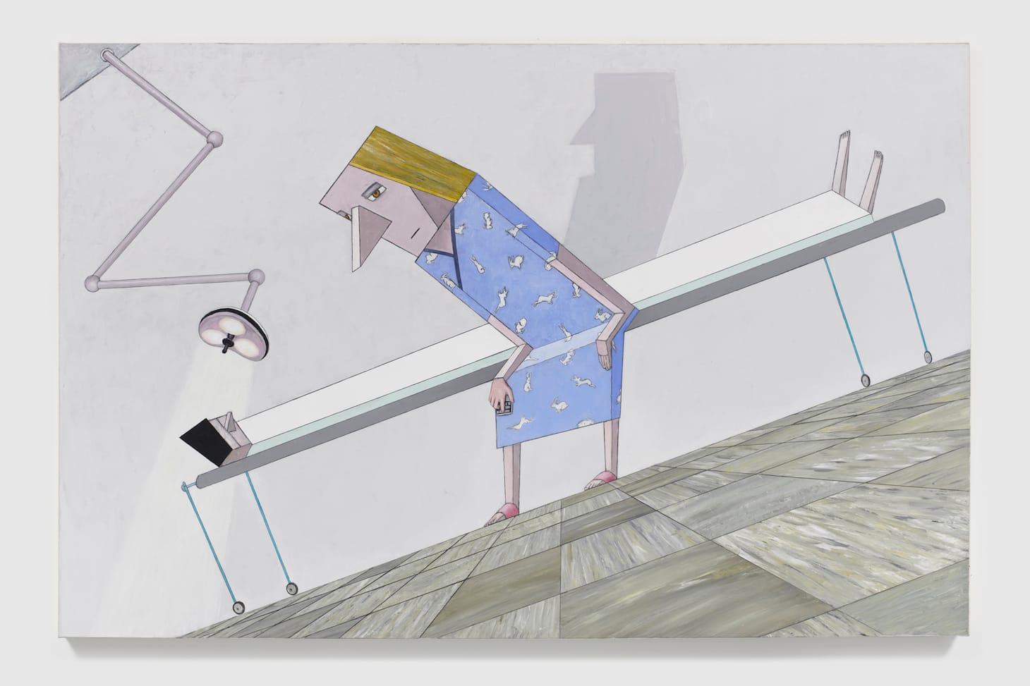 I find that, in my work, humor has to enter into play somewhere. There is usually some aspect that will make me smile and get me more engaged. I don’t even start a painting if I don’t know what the basic structure and actors are going to be. The process is about making a believable tension between the formal structure and the situation depicted. In this way, banal situations seem unfamiliar and disorienting.