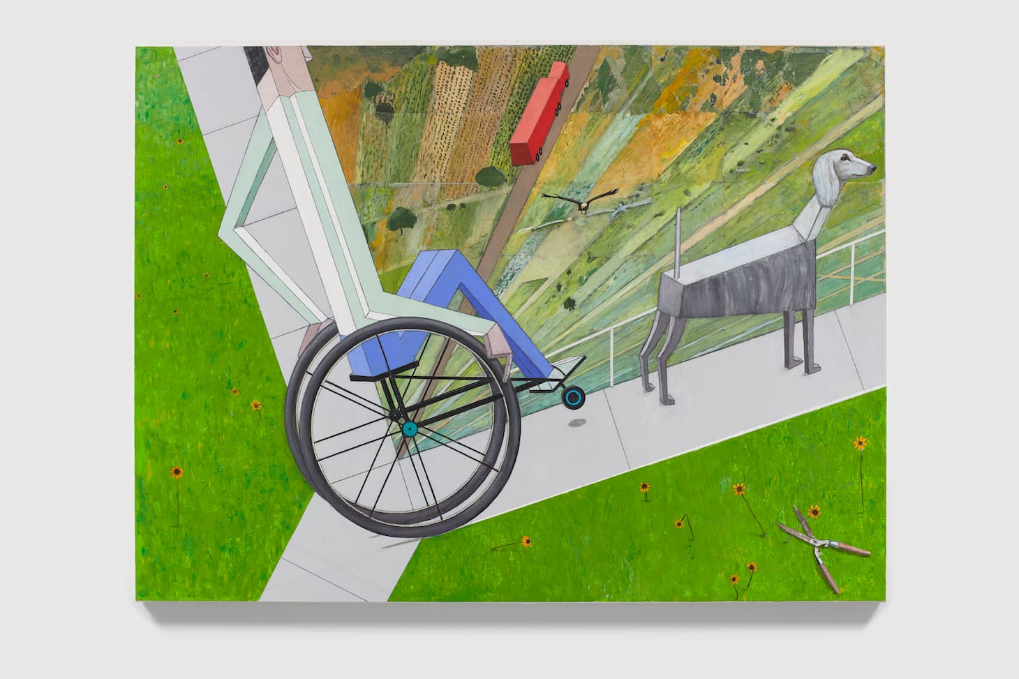 Mernet Larsen’s paintings gradually reveal themselves. At first, we might recognize the internal logic and structure of her compositions: their symmetry or the hard-edged geometry she uses to render characters and spaces. But the longer one stands in front of her paintings, the more quizzical and humorous they become. They evoke the anxieties of daily life, and yet there is delight in responding to the open-ended, sometimes absurdist questions they pose. Is the chicken a polite offering from a monk or is it under threat in this hand-off with an angel? Is the lifeguard presiding over the shore or wielding a rifle at a dystopian abandoned airport? Ordinary garden shears, a bald eagle, and a red truck become predatory symbols in a suburban street scene shown from various vertiginous perspectives.