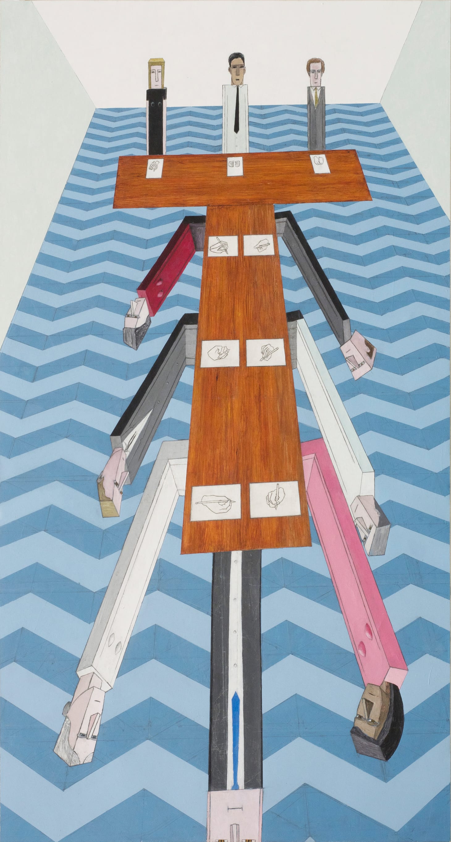 JS: You have made several paintings of faculty meetings, as well as depictions of conference room and situation room meetings. In them, you show figures arranged in a disorienting reverse perspective. How did reverse perspective become incorporated into these subjects?