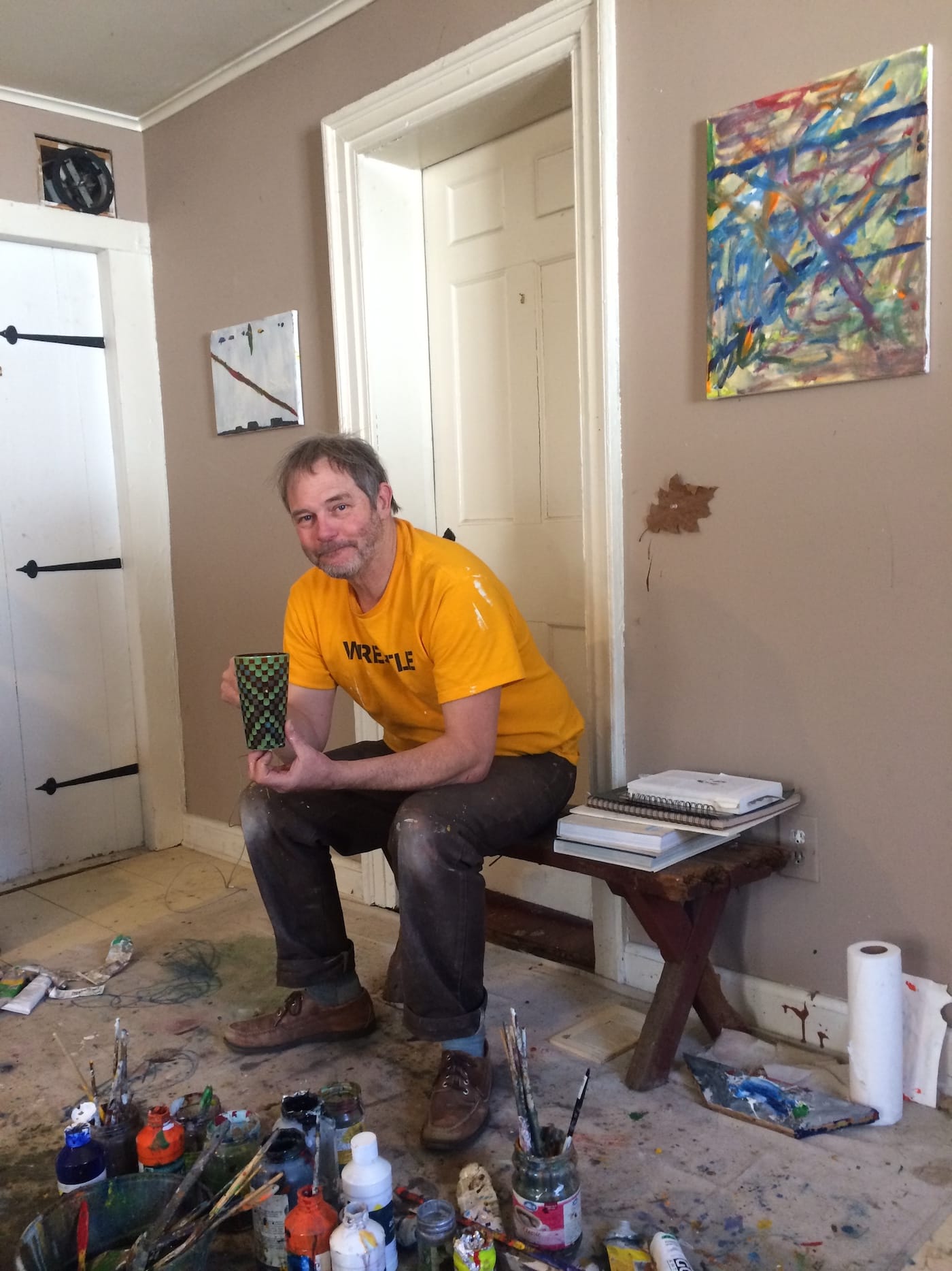 Peter Acheson, who lives in upstate New York, uses his living room as his winter studio. The “hearth,” which we sit around, is an old bookcase/hutch. He uses it as a provisional viewing station for paintings — propping them up and rotating them on the shelves and along the floor — as we talk. It’s also where he keeps the sound system and a stack of CDs. The Stones or Dylan are usually on deck. A paint-splattered tarpaulin lies in front of the bookcase, and chairs are pushed to the edges of the room. Jars of acrylic paint and yogurt containers filled with brushes are right on the floor; this is where he works.