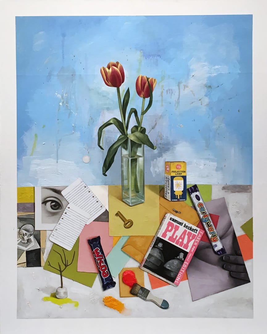 RB: The oil paintings start out as abstractions. I’ll put paint and textures on the canvas. Things that happen on the canvas recall other experiences in my life. I never set up the still life arrangements fully. It’s always an accumulation of impulses that find each other. I feel like a conduit more than a director.