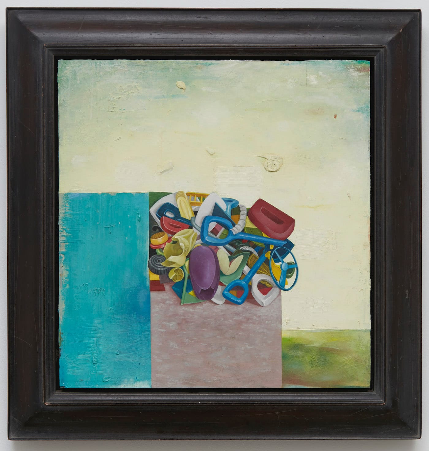 Then I thought about how color fields are versatile and don’t need to be oriented in a certain direction. I let the landscape crawl around the edges of the painting. I would end up with an object in the center and four landscapes at the edges. I thought, “Four paintings in one. It’s a bargain for whoever buys that one!”