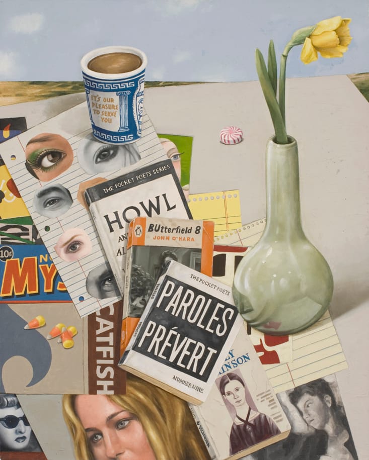 Baker has made oil paintings of tabletops tilted upwards to show the clutter and strange collage of everyday matter: mints, coffee cups, books, photographs, notepaper, and flowers.