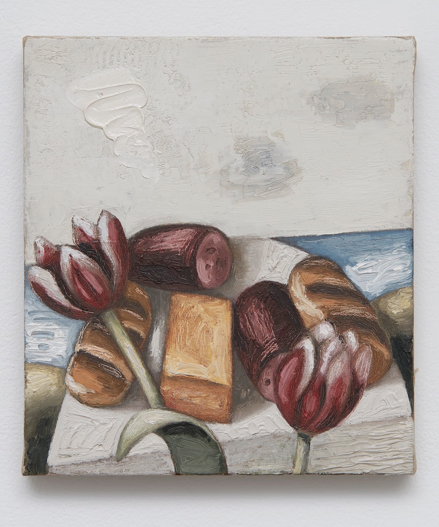 He will often turn his attention to a single object, or a pair of things that don’t really go together, like a paper price tag and a vase of tulips. The surfaces of the paintings are markers of Baker’s dedicated attention to the ordinary and the esoteric: they are as touched as the objects he renders. Although the paintings often have a poetic strangeness and mystery, they are also very playful. He paints bags of flour and cereal boxes, and he’s made trompe-l’oeil sculptural objects of a package of Chuckles and toasted marshmallows on a stick.