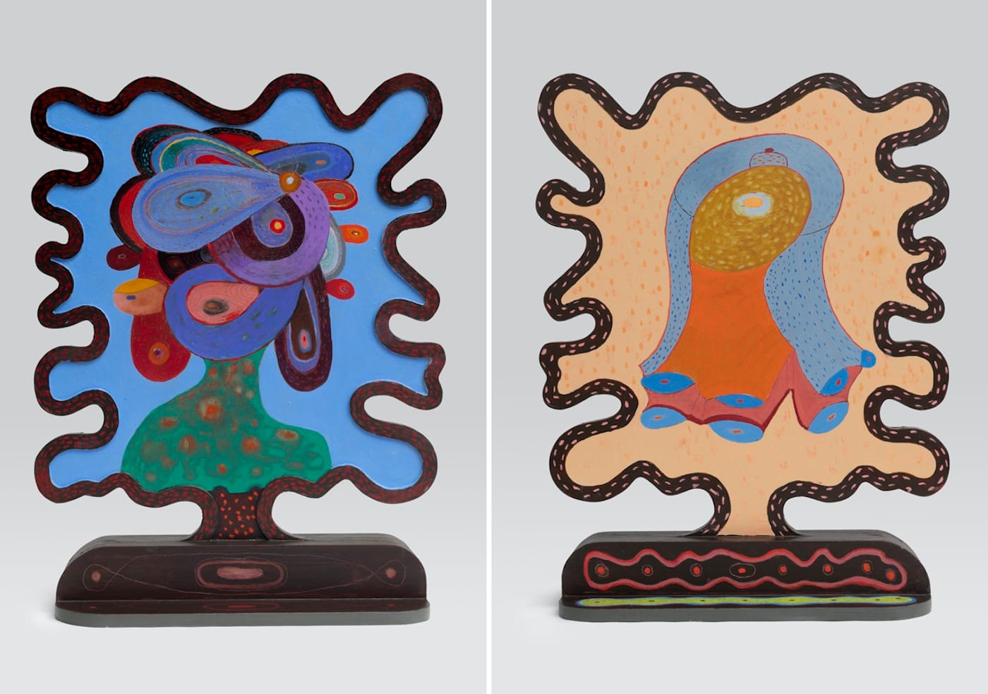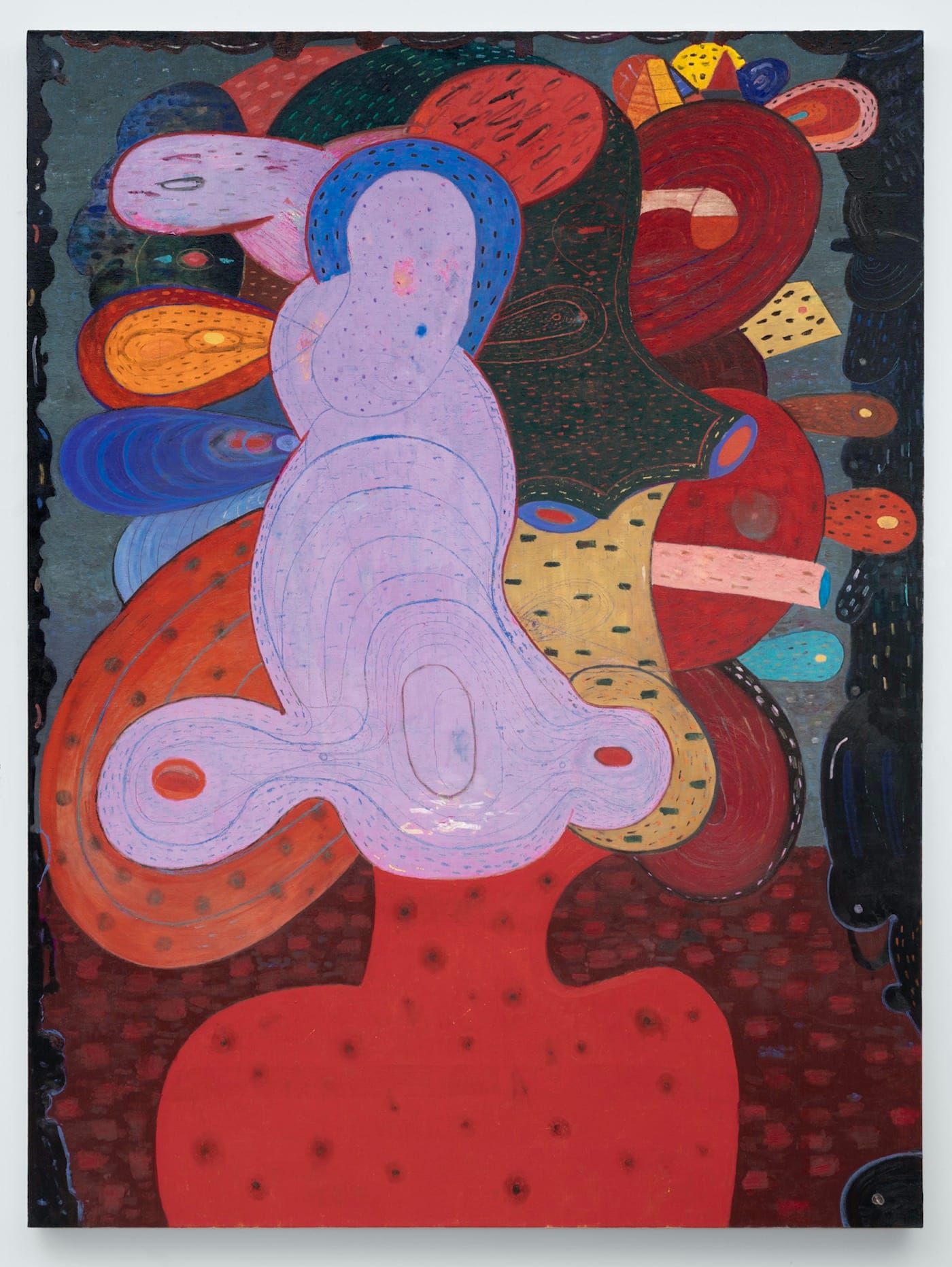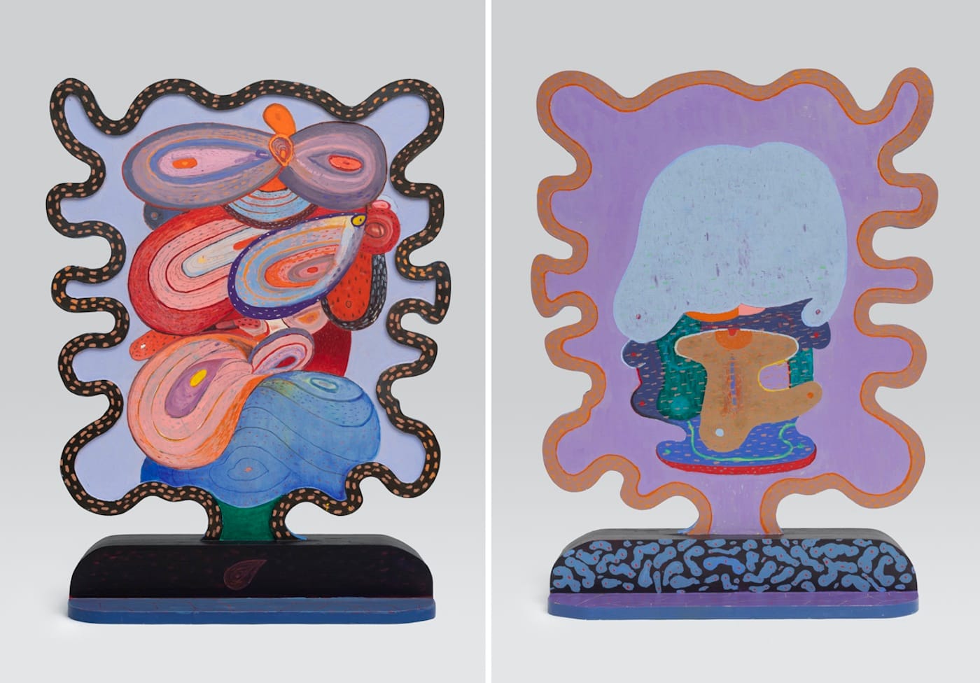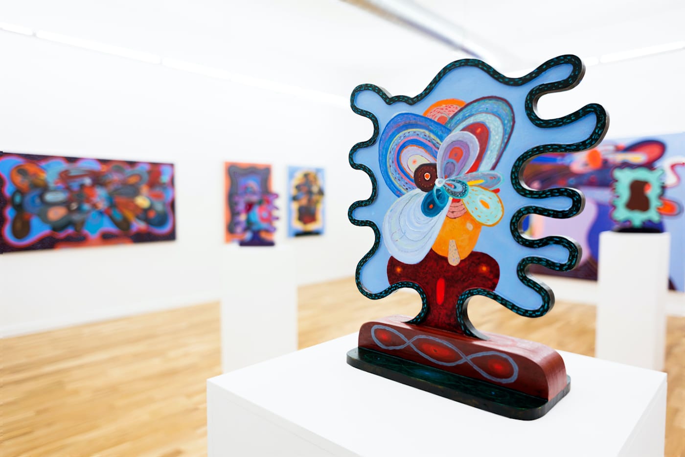 We met during the week of Expo Chicago, where Western Exhibitions featured his work in a solo presentation. I find that, in the middle of the art fair, his work radiates a palpable joy. It stems from the paint itself: the pleasure of how pigment is put down, scratched through, and marked with daps and dots. It was in the oddity, playfulness, and suggestiveness of the forms, the variety of color in a single work, and the way forms multiply and spiral outward from the center. On view is a combination of wall paintings and two-sided freestanding works on loopy, shaped MDF. The forms suggest wacky hairdos and heads seen from behind, but the shapes within them droop and probe and project out like amoebas, ears, and tongues.