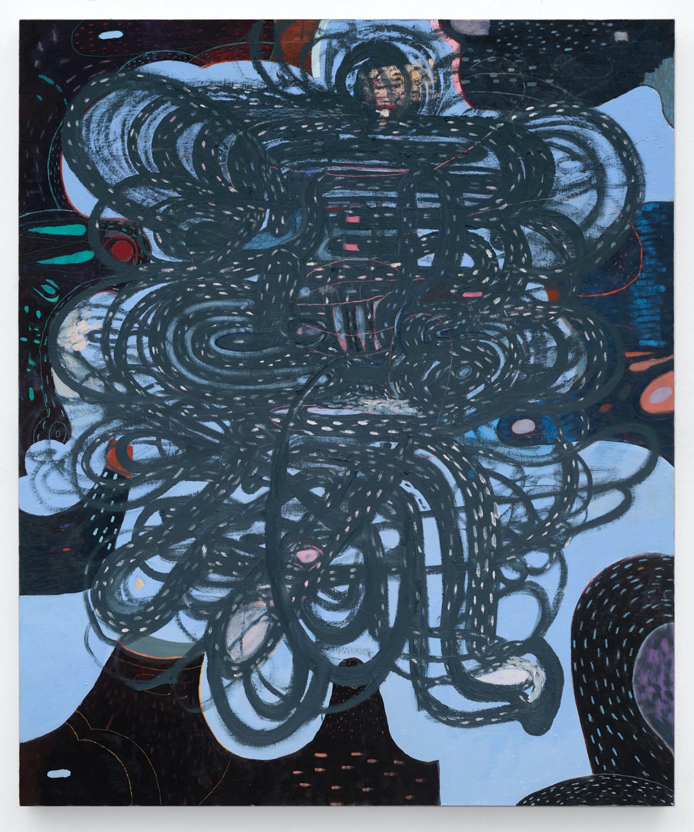 RH: I want things to somehow get arrested. If I just painted the loopy forms over and over again, there would be a continual unfolding. The forms would not be fixed enough, and could “slide off” of the painting. I want things to be held in place, and I want a sense of gravity. Even if it’s topsy turvy, you understand the painting in the way you understand the world. You’re standing with your feet on the ground.