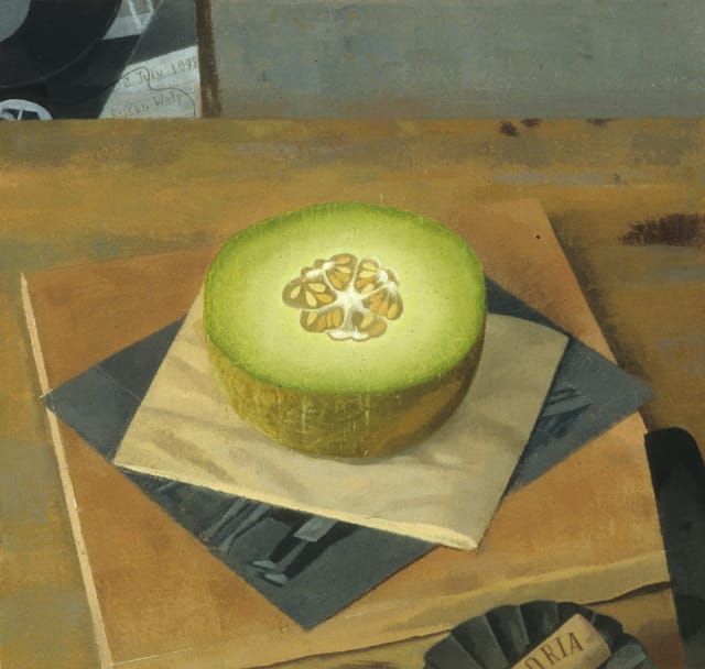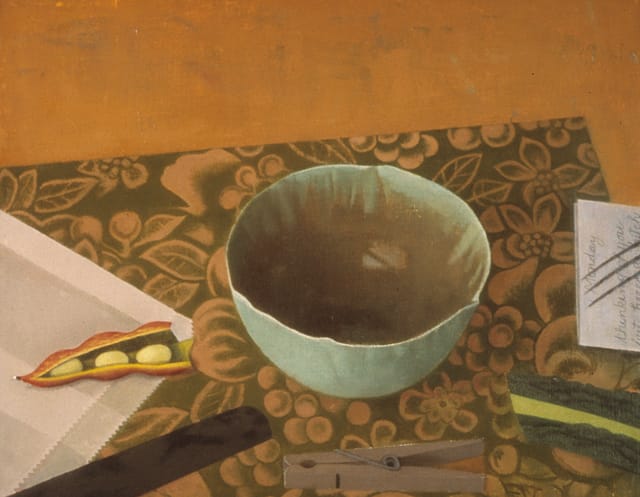 She makes small-scale still life paintings that depict both likely and unlikely combinations of objects: halved citrus fruits, teacups and porcelain bowls, blueberries, tulips and poppies, along with Xeroxed pages, chewing gum wrappers, and “scrunchie” hair elastics. The deliberate placement of objects, and her subdued palette, direct our attention to the range that is possible among close tonal relationships, and the integrity and power of small things.