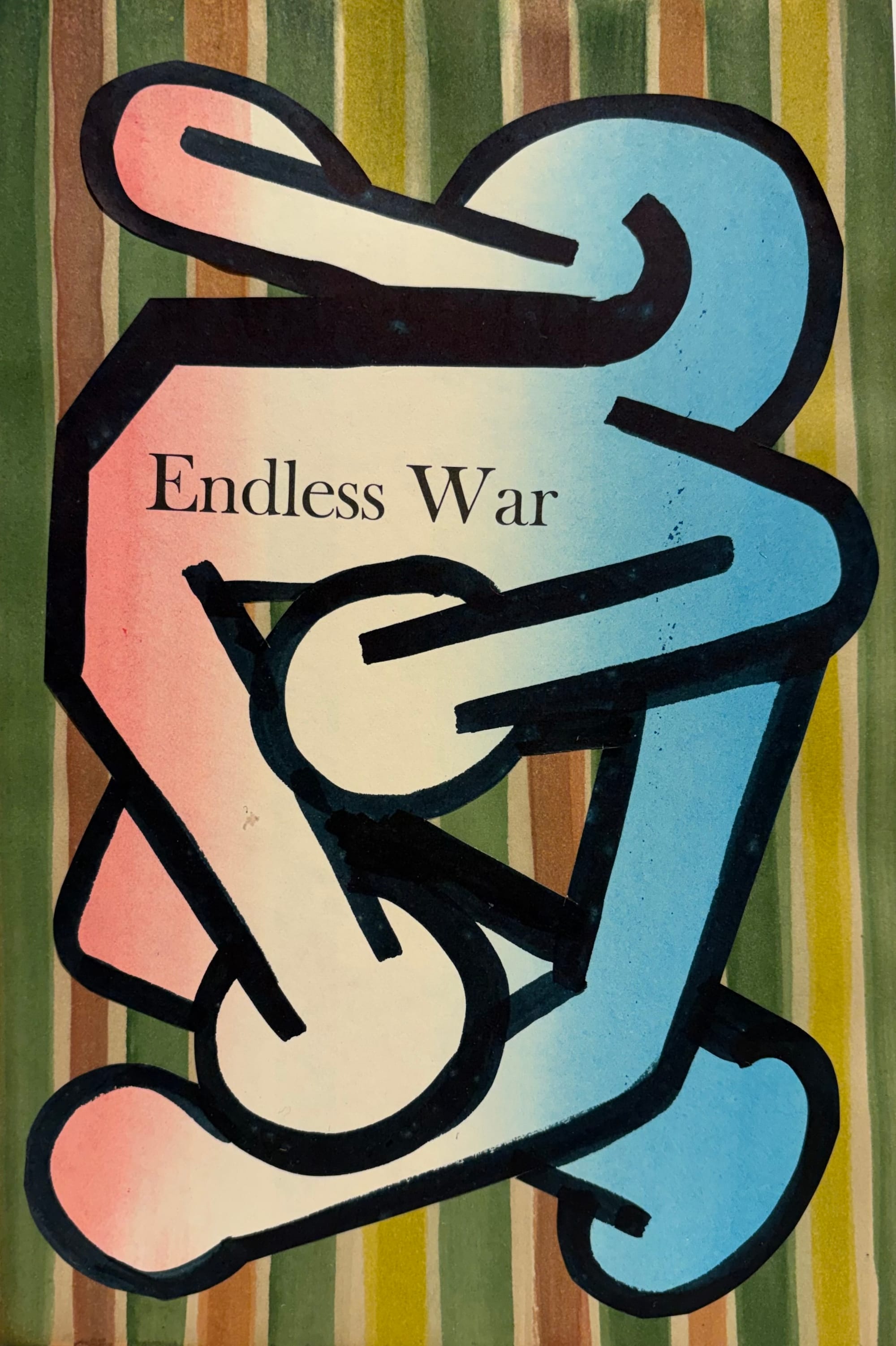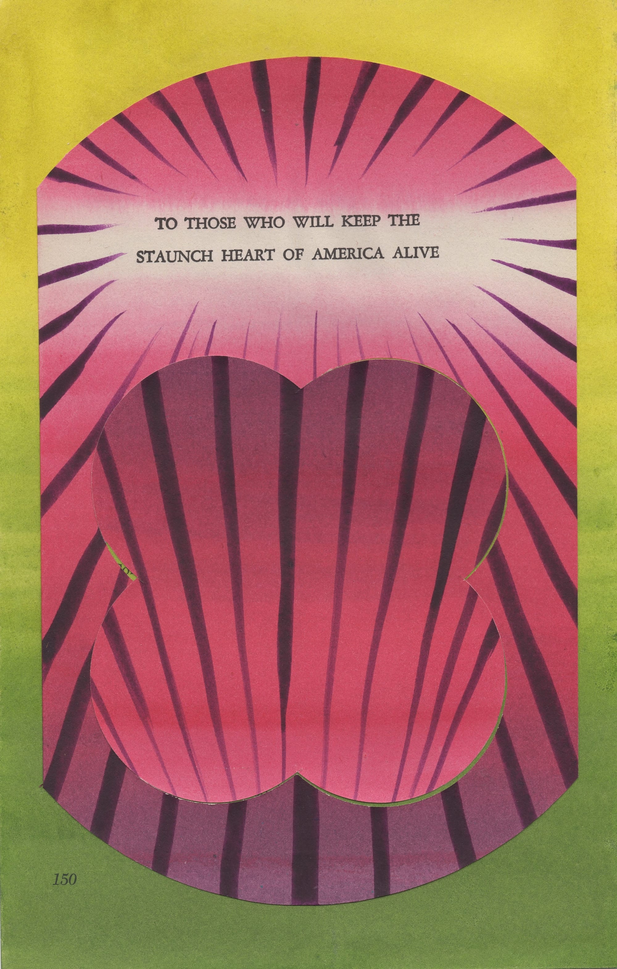 Tom Burckhardt, “Staunch Heart Of America” (2023) (left) and “Endless War” (2025) (right), both ink on book page (images courtesy the artist)
