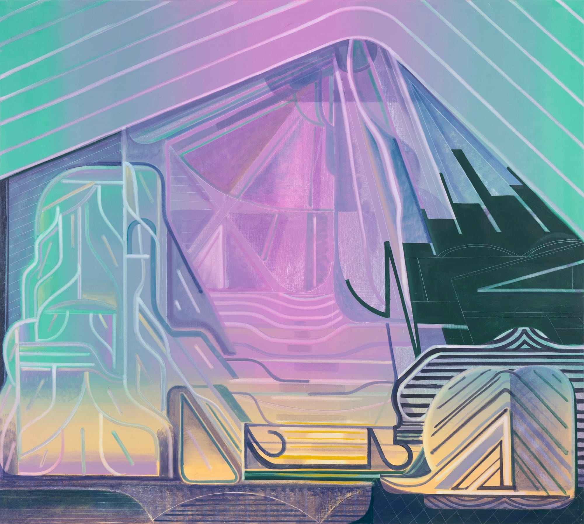 Although best known for his abstract paintings, Burckhardt has also created walk-in installations, plein-air paintings in Maine (where he spends his summers), and intimate collage paintings on found book pages. His most recent abstractions exude an otherworldly light, allowing suggestive forms to breed and layer. He uses and manipulates the logic of grids, directional axes, and linearity while combining colors and forms that invoke a range of visual culture: art historical images, banal patterning, and mechanistic animation.
