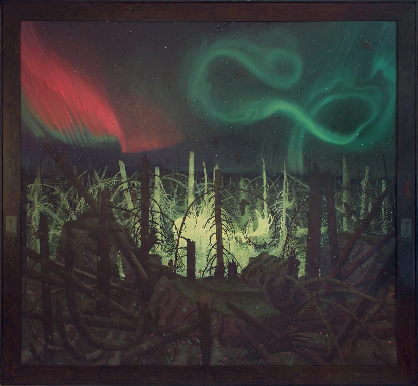 As beautiful as the fields and old stone walls around his home are, his paintings are actually studio inventions, based on memories of canoeing and camping in the northern reaches of Wisconsin, Minnesota, and Canada — a true wilderness. They are both highly fictionalized and hyper-real: invoking sublime American landscape painting and magic realism, with a dreamy but tightly realized rhythm of compositional organization. The landscapes are populated by dozens of intricately rendered creatures: wolves, bears, moose, and birds — running or flying from right to left, or facing us head-on and unflinching. His wide, flat, pine molding frames are part of the work: stained and decorated with painted images of animals, tracks, canoes, and fish.