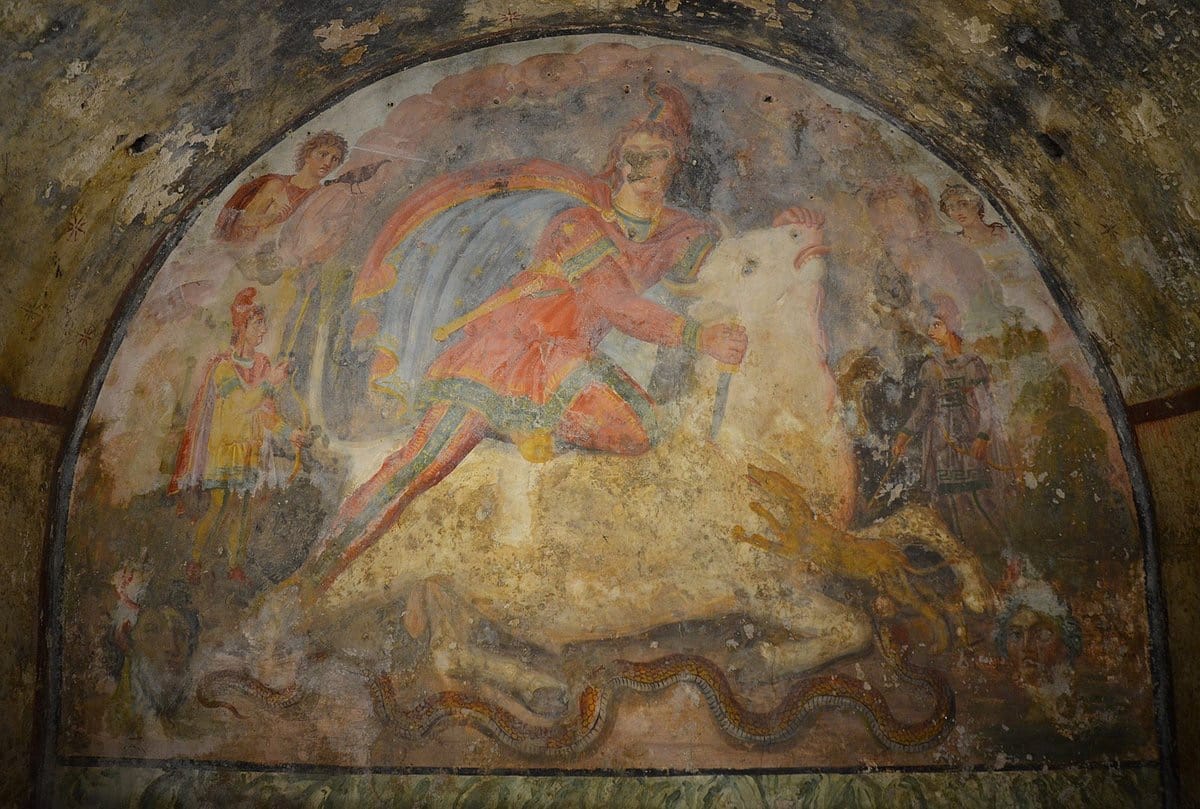 And temples, constructed to honor him, called mithraea, were a reflection of the cosmos itself. Often Mithras was depicted in the center, slaying a bull. Frescoes and reliefs of Mithras preserve the stunning color that decorated these underground mithraea. Their existence under the earth often helped to preserve the color so they may be viewed today. By some counts, 400 archaeological sites show evidence for the worshipping of the god and his cosmos.