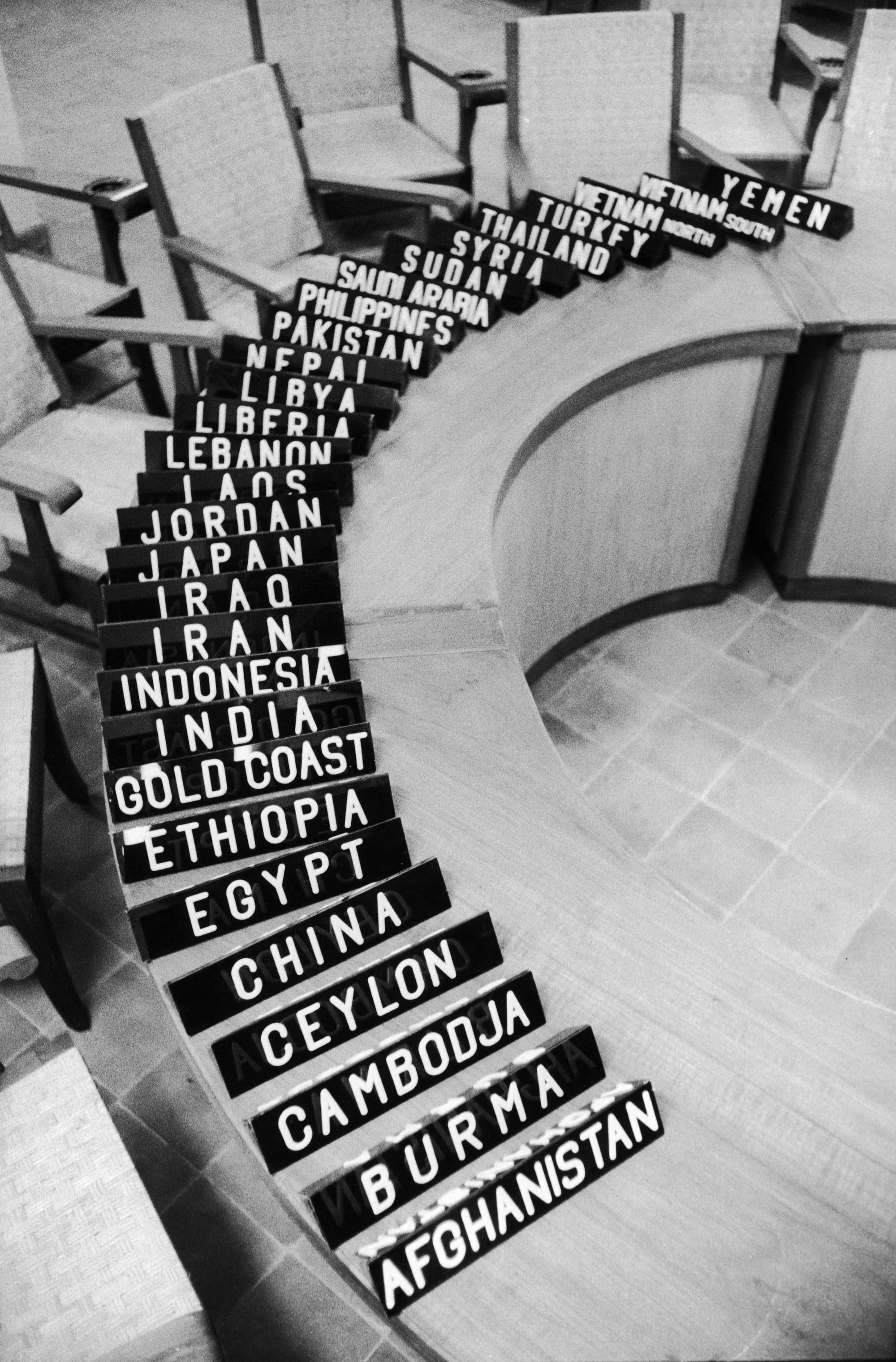 Left: Place cards from the Asian-African Conference, Bandung, Indonesia, April 1955 (© Howard Sochurek/The LIFE Picture Collection/Shutterstock; photo Howard Sochurek/The LIFE Picture Collection); right: Abanindranath Tagore, Khuddur Jatra (c. 1934–36), artist’s book, page 71 (photo Atreyee Gupta, 2024; Collection of Saranindranath and Mita Tagore, Kolkata)