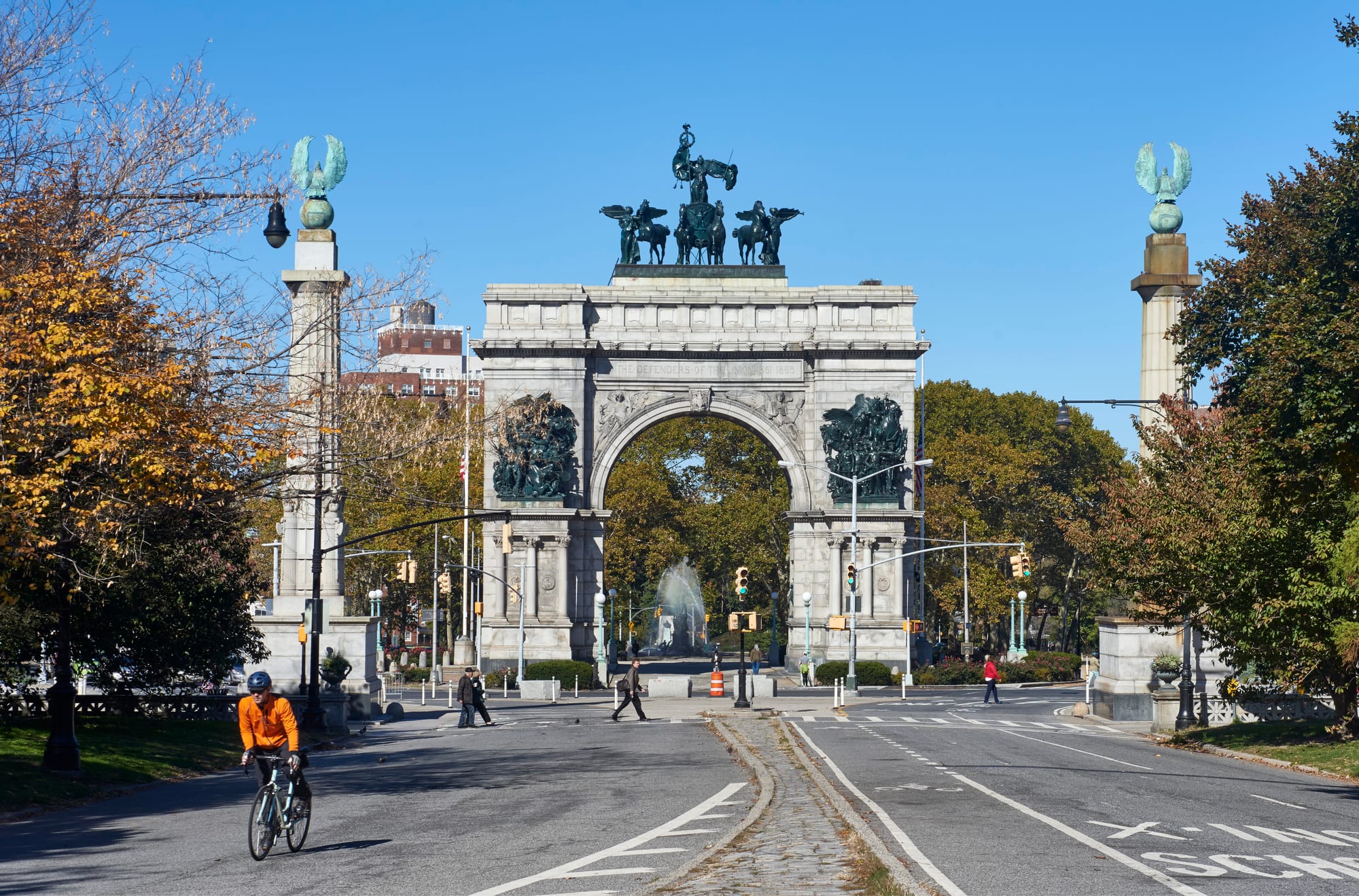 Before the traffic circle existed, the area was originally the site of the Battle of Long Island (or the Battle of Brooklyn) in the Revolutionary War, the first major battle after the signing of the Declaration of Independence. During the construction of Prospect Park in 1867, park creators Frederick Law Olmsted and Calvert Vaux designed the elliptical plaza as a formal entrance to the park. The plaza became the location for the Soldiers’ and Sailors’ Memorial Arch in 1892. Designed by John H. Duncan, the granite monument was erected to honor those who served and fought in the Union Army during the Civil War.