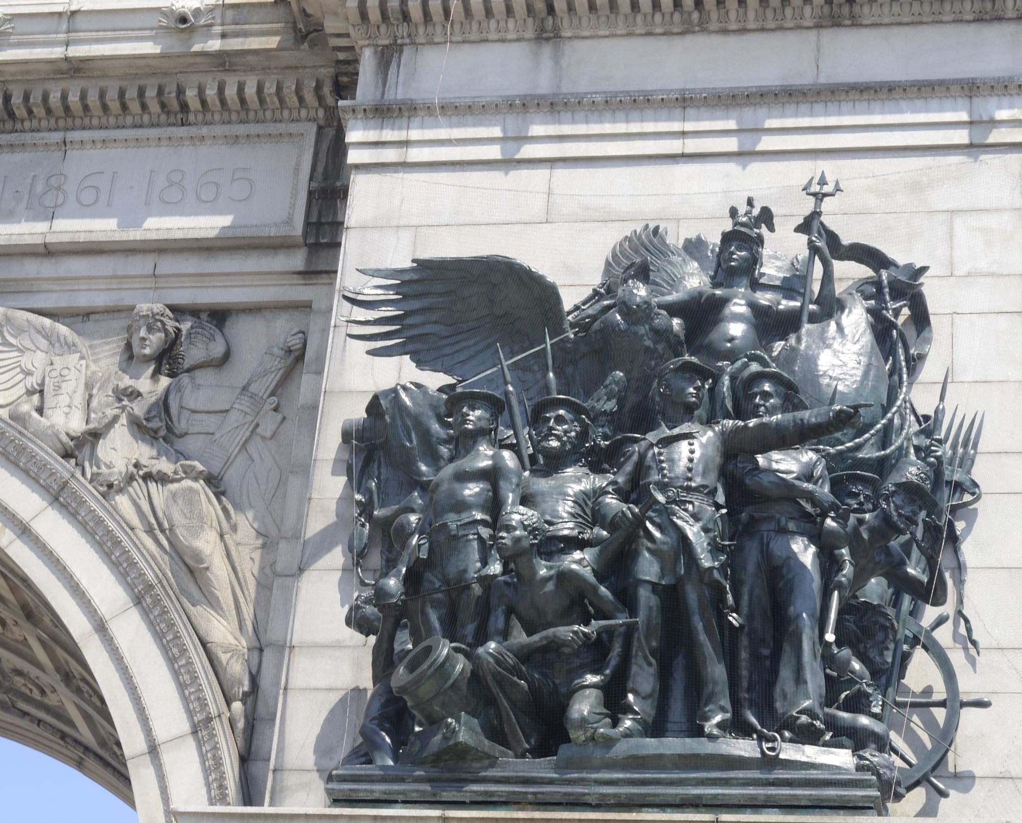 The tall archway is decorated with bronze statuary groupings designed by Frederick MacMonnies that depict the goddess Columbia, a feminine personification of America riding in a horse-drawn chariot, and Union Army soldiers and sailors who fought in the Civil War. In the statuary group on the right, a Black male soldier is depicted holding a pistol, crouching in front of the White soldiers standing behind him.