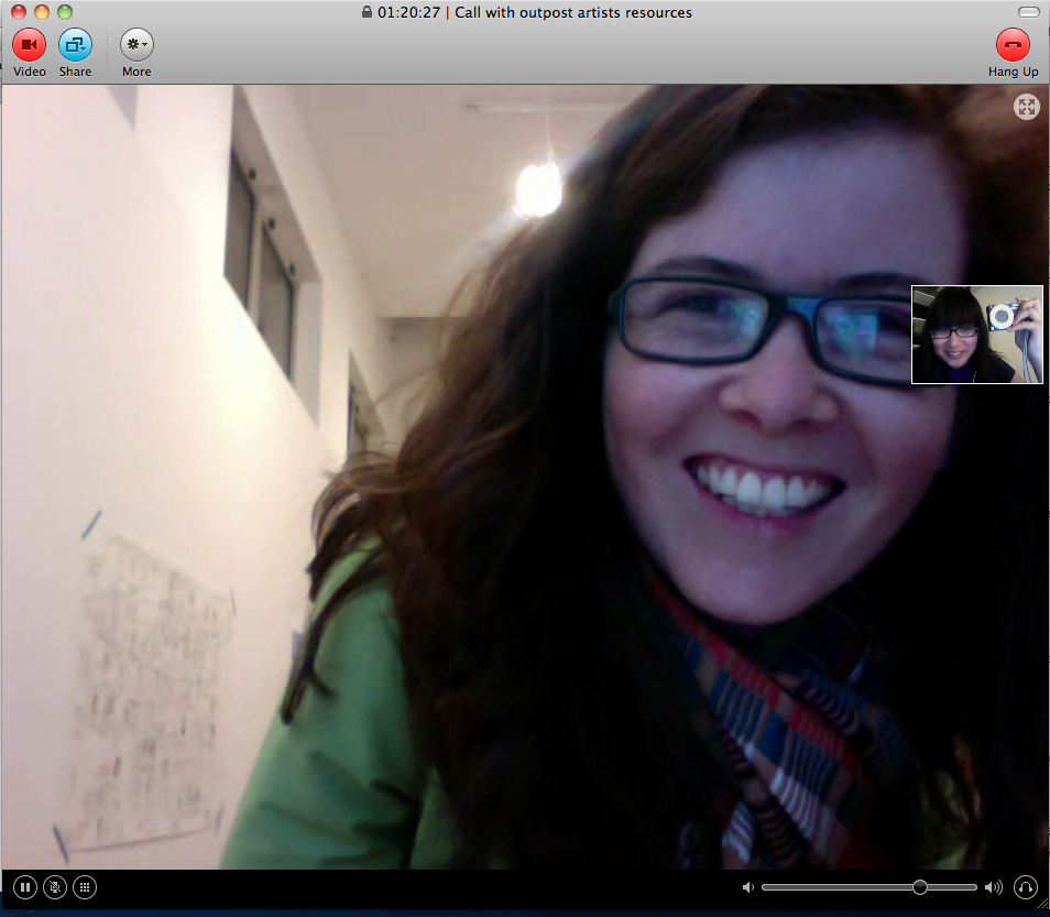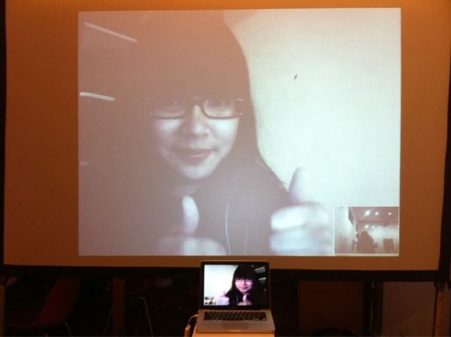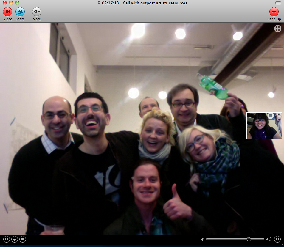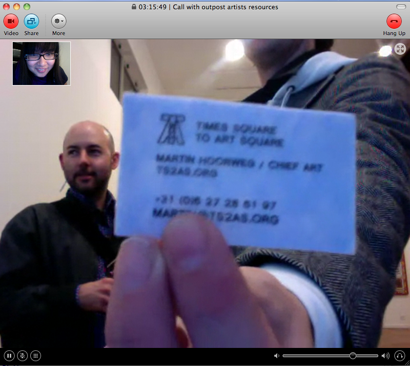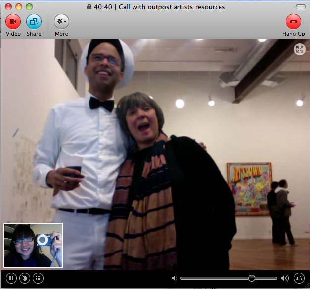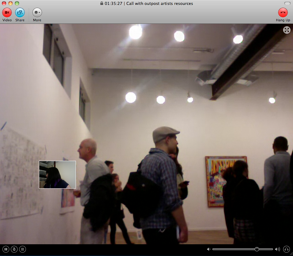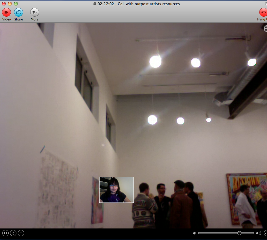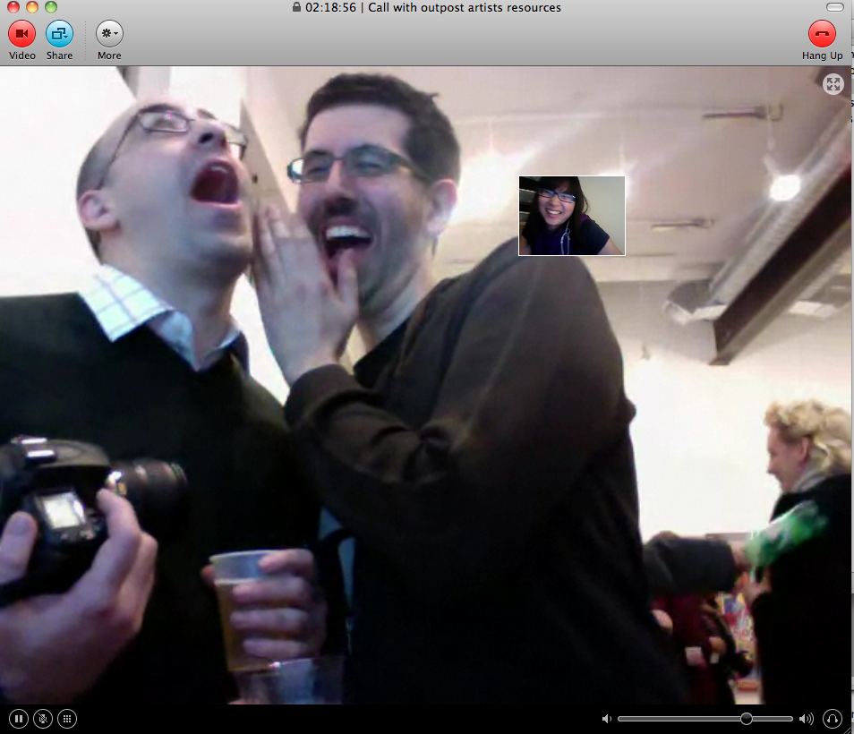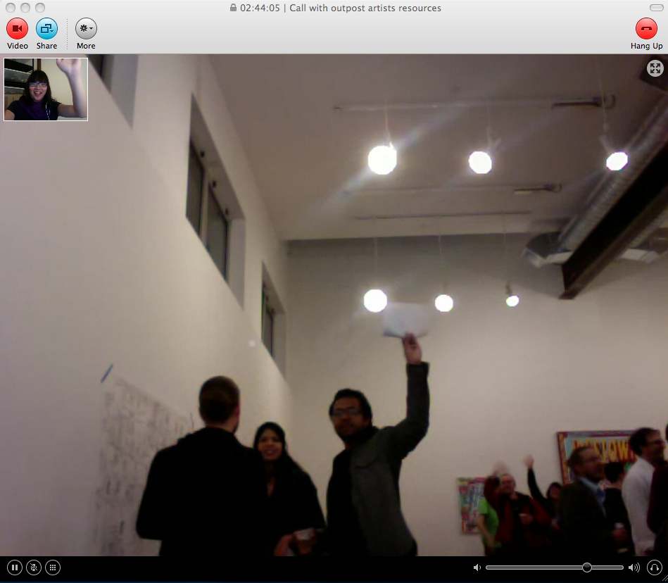 Beamed in from somewhere in Los Angeles, I was able to attend the opening virtually through Skype video (though I was a bit of a wallflower) and a large projection of myself. I chatted, took pictures, even traded cards, all via the screen, and I then posted the images onto Facebook.