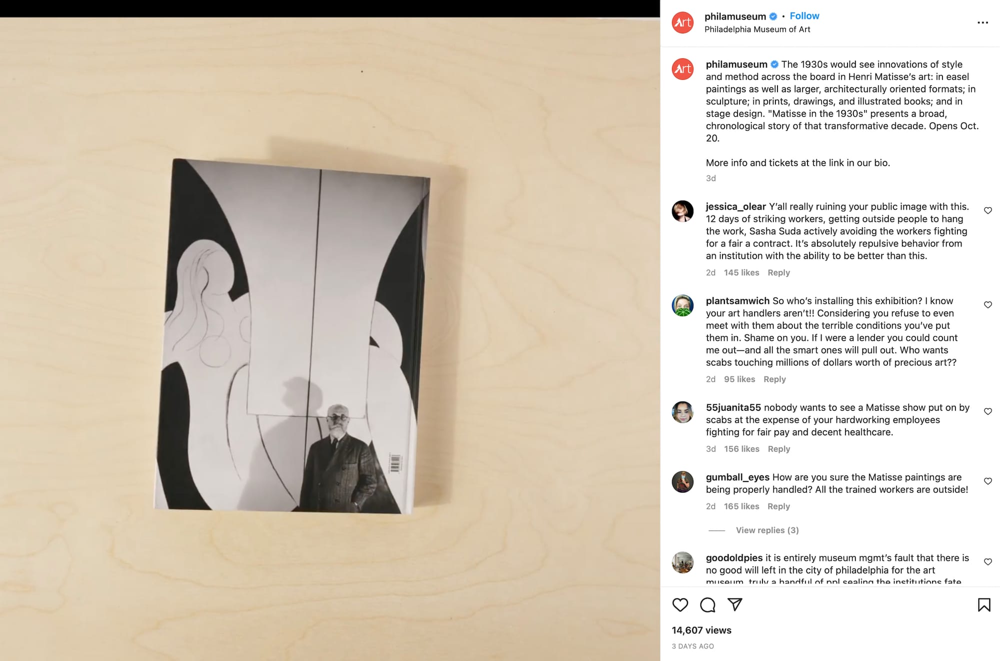 PMA has feigned normalcy on social media: Its feeds remind visitors that the museum is still open, highlight notable works in the collection, and advertise its upcoming Matisse show. But users have not allowed the museum to ignore the workers picketing outside its doors, and hundreds of critical opinions overran PMA's comment sections before the museum shut them down.