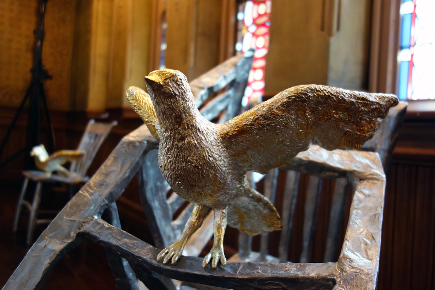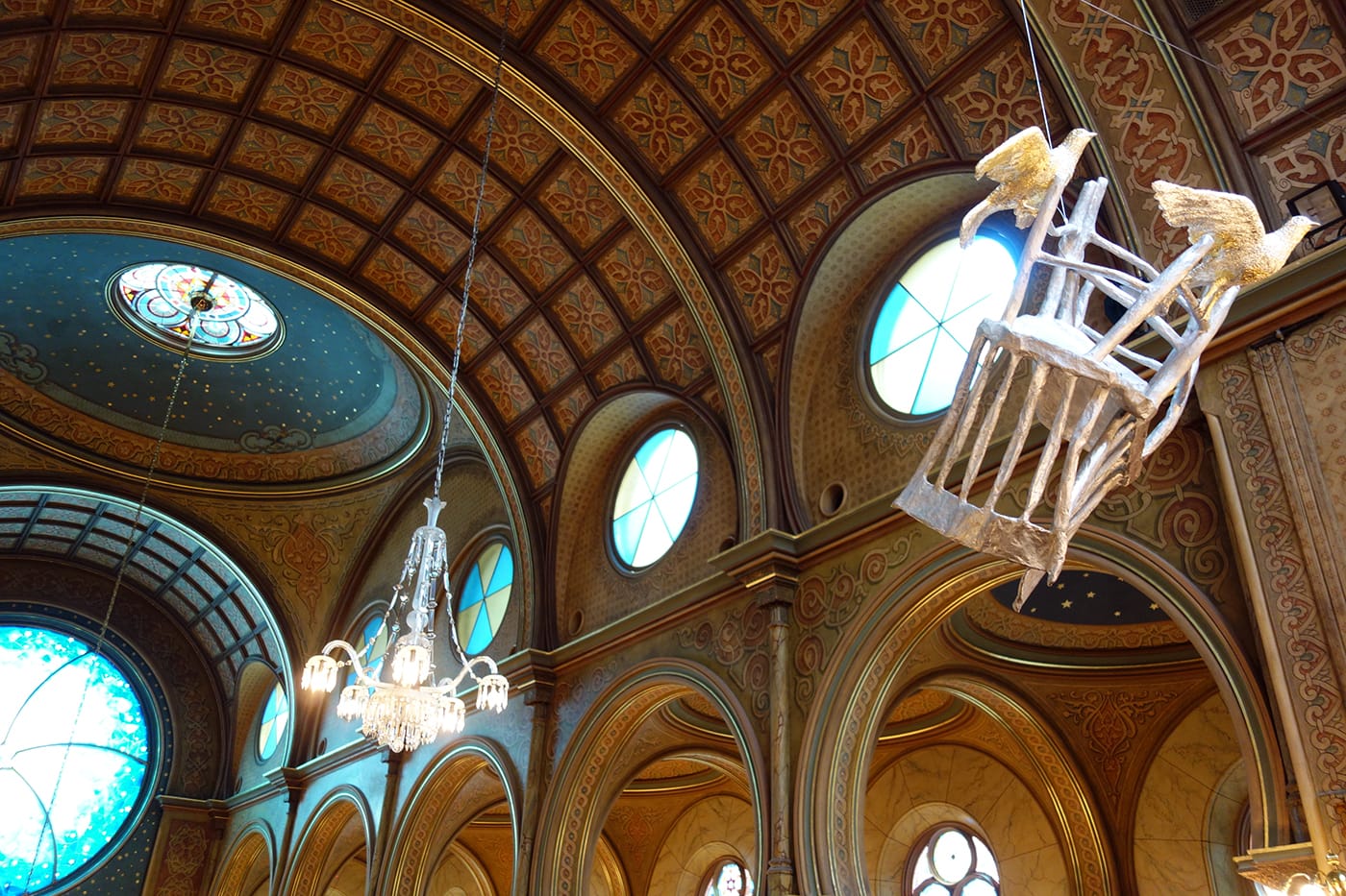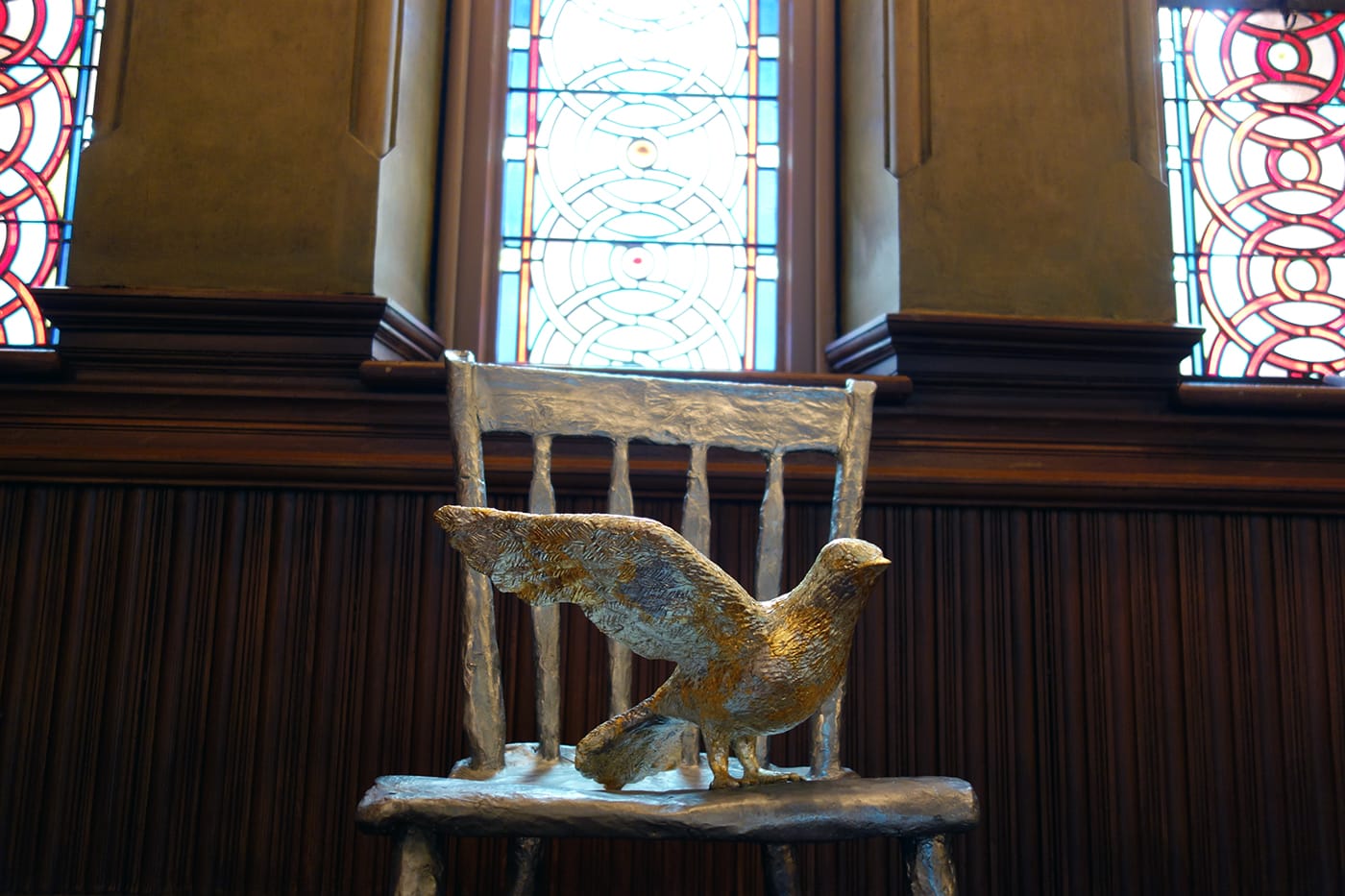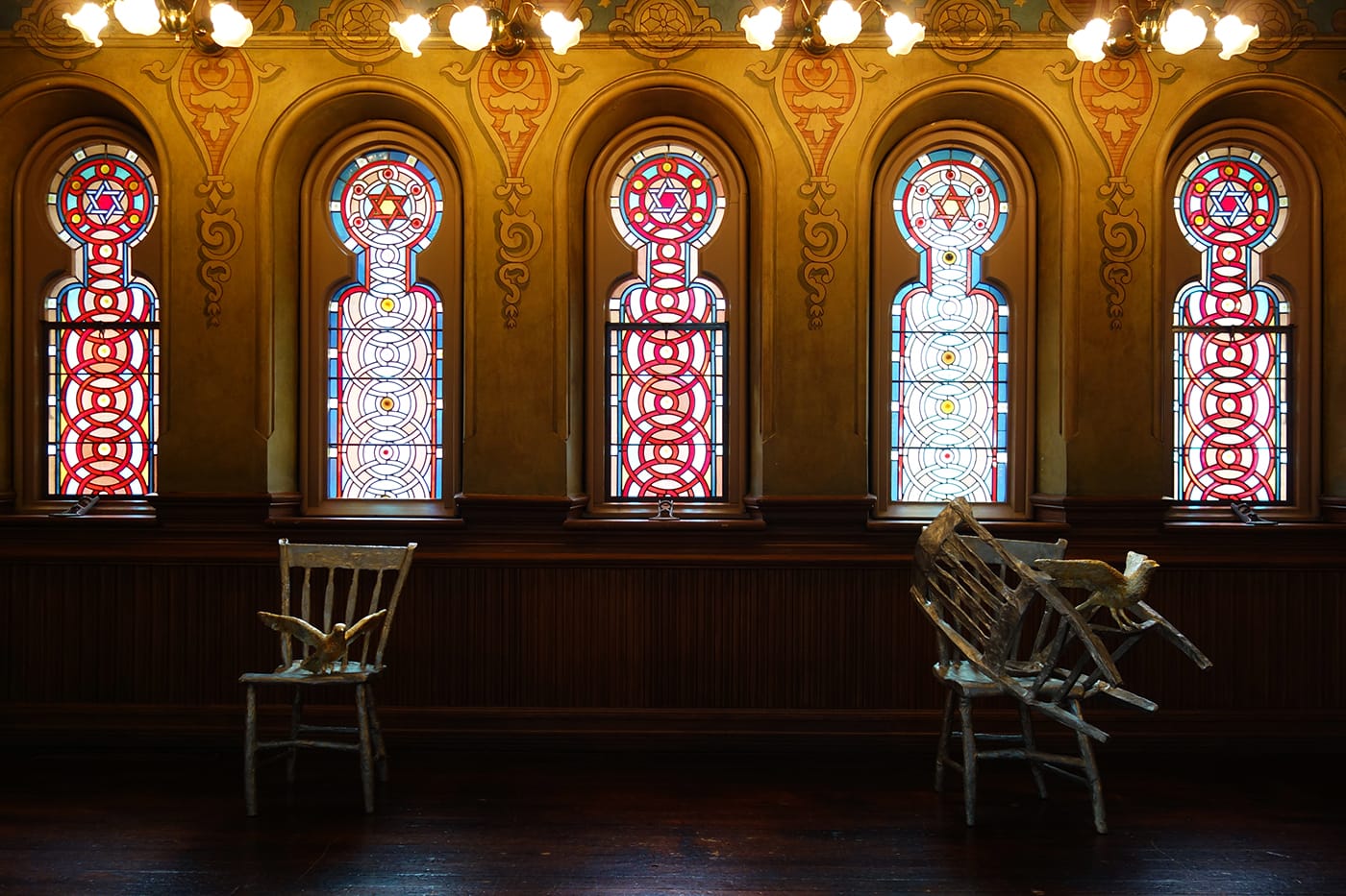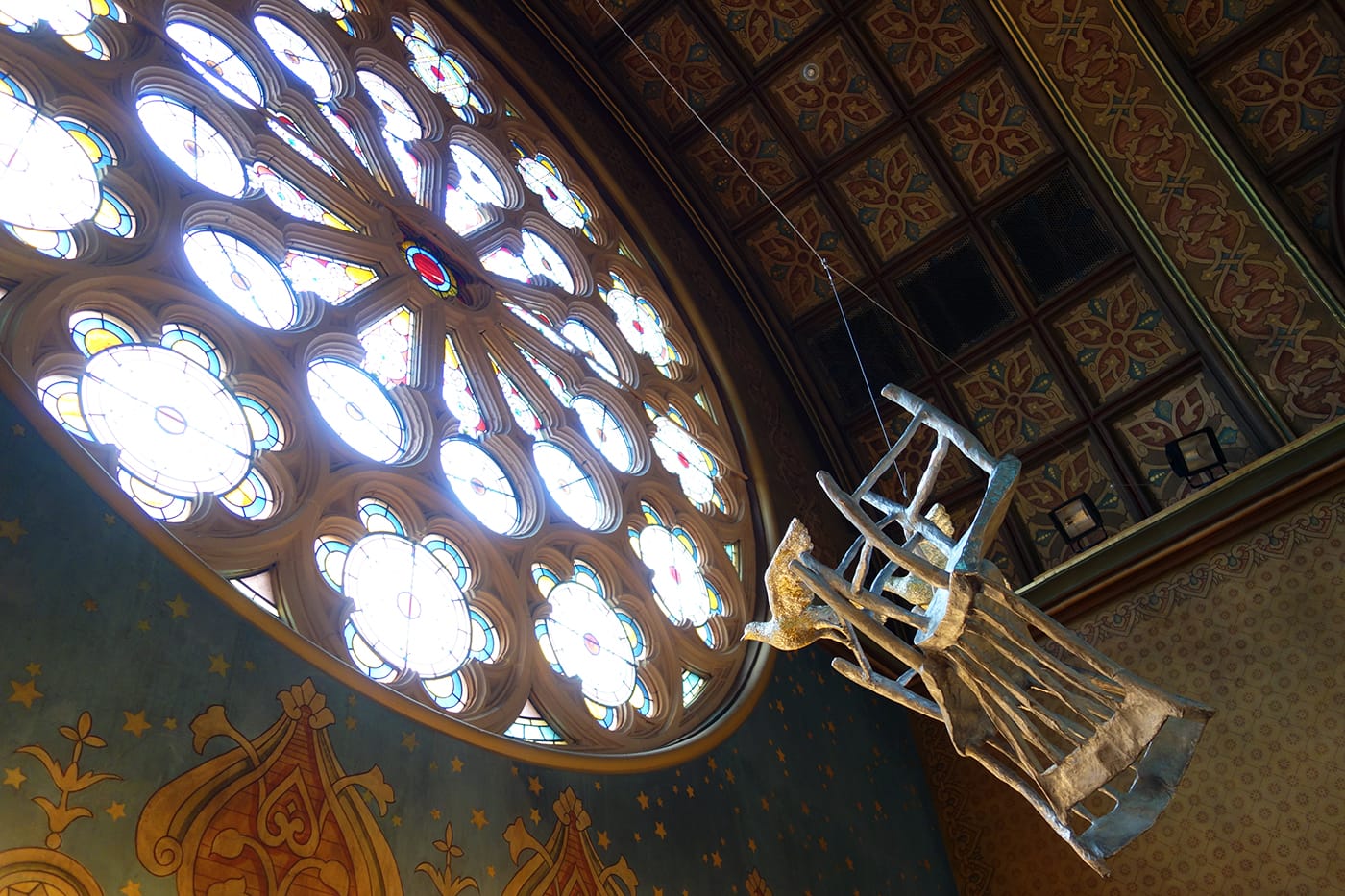 Before the restoration of the Eldridge Street Synagogue, birds flew in through holes in the roof. The animals roosted in the 19th-century structure that was once a haven for Eastern European Jews on Manhattan’s Lower East Side, but it had fallen into a decline because of a shrinking membership and its leaking sanctuary was closed off half a century ago. Now three sculptures by Kiki Smith recall this moment of the synagogue’s decay, with gold leaf-covered birds perched on aluminum chairs. They’re installed on the third level women’s gallery of the synagogue — opened as the Museum at Eldridge Street in 2007 — with one suspended up by the rose window, soaring in the kaleidoscopic light.