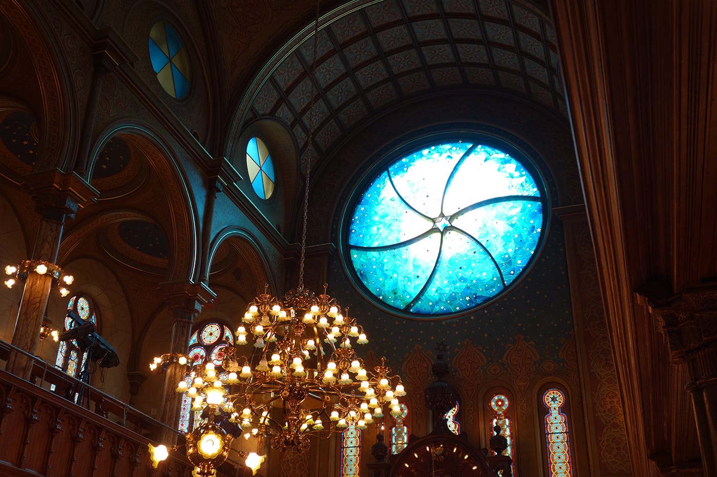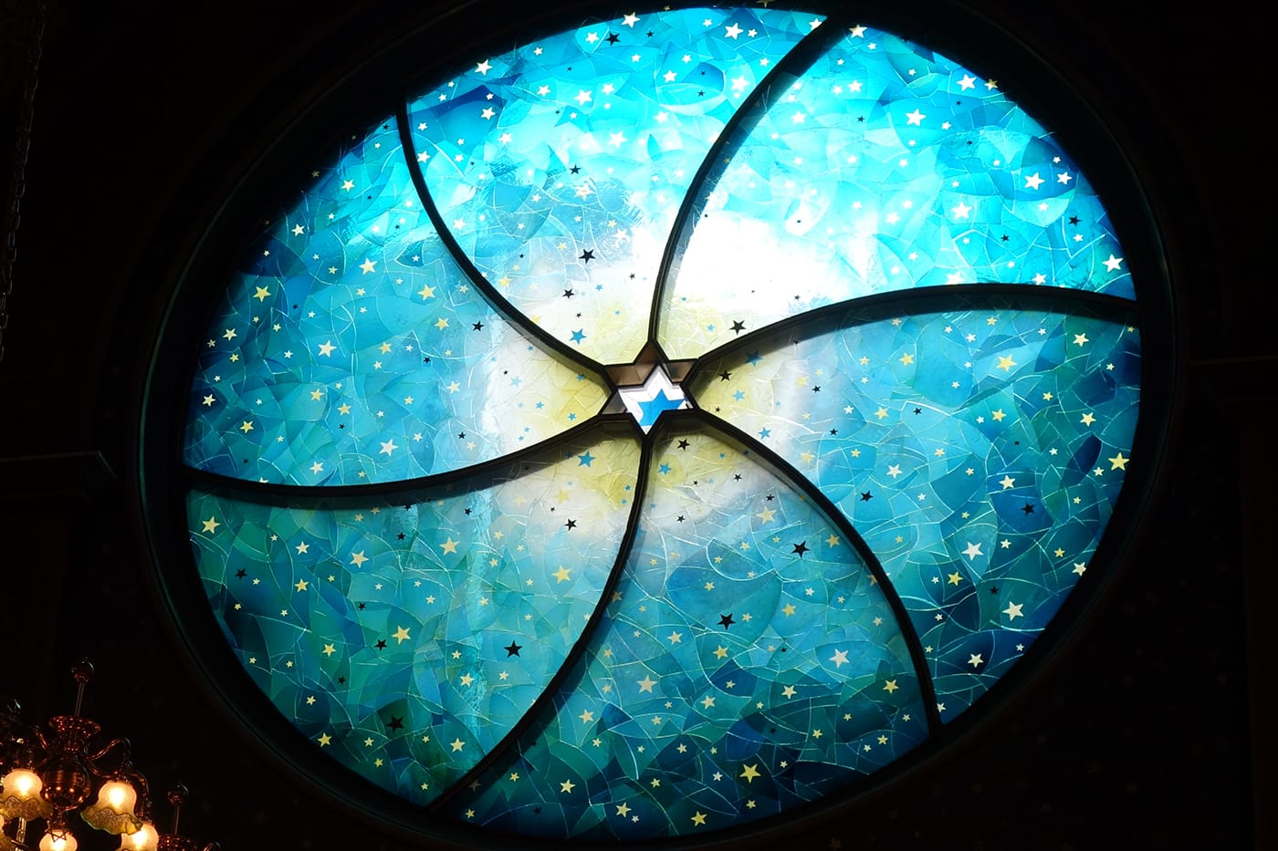 In their work on the stained glass window, Smith and Gans demonstrated a similar sensitivity to the historic space. Down on the first floor, in the museum’s Michael Weinstein Art Gallery that opened in 2016 for temporary exhibitions, is a small installation of materials related to the stained glass window. Stretching 16 feet in diameter, the window presides over the ark on the east end of the sanctuary. Its around 1,200 of pieces of traditional stained glass, contained on laminated sheets of clear glass with silicone, feature a constellation of five-pointed stars and a central Star of David. From a distance, it is a vortex of celestial shapes; closer examination reveals that the five-pointed stars and shades of blue echo the original painted interior, and the Star of David recalls the traditional decoration of the synagogue.