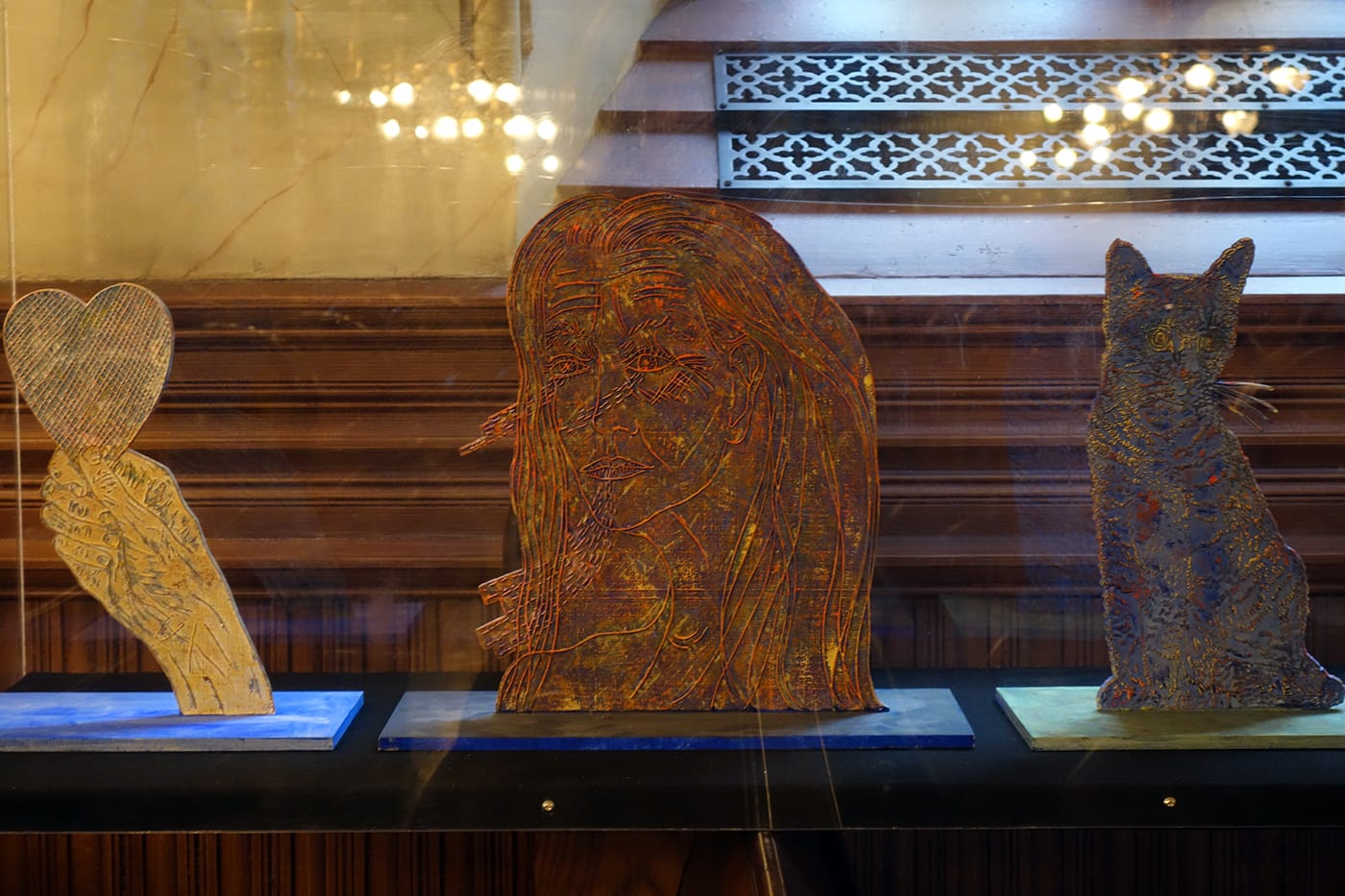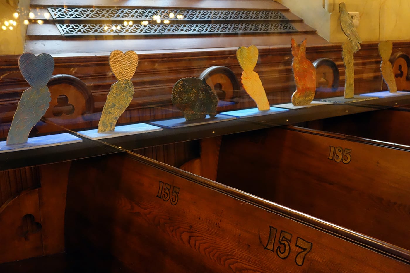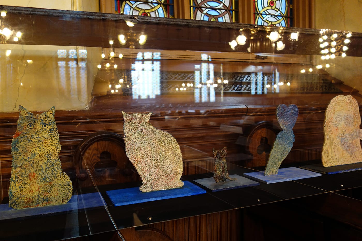 Down in the main sanctuary, dozens of flat wooden sculptures are lined up in long cases below the windows. Visitors can enter the pews, with their floors grooved by decades of rocking motion by praying congregants, and examine their colorful hand-painted texture. Some are inquisitive felines named for characters from T. S. Eliot’s “Old Possum’s Book of Practical Cats,” others are disembodied hands grasping hearts, symbols of charity. “For the small sculptures shown in the main sanctuary — wood images of hands holding hearts, birds, cats, and a woman’s face that looks like her own — she thought that their painted surfaces would converse nicely with the colors in the stained glass windows that line the walls, and she was absolutely right,” Johnson said.