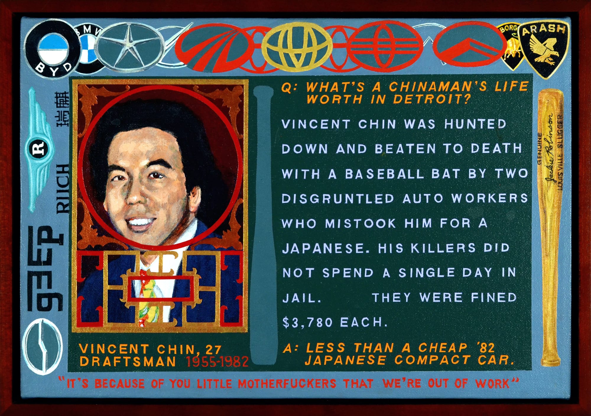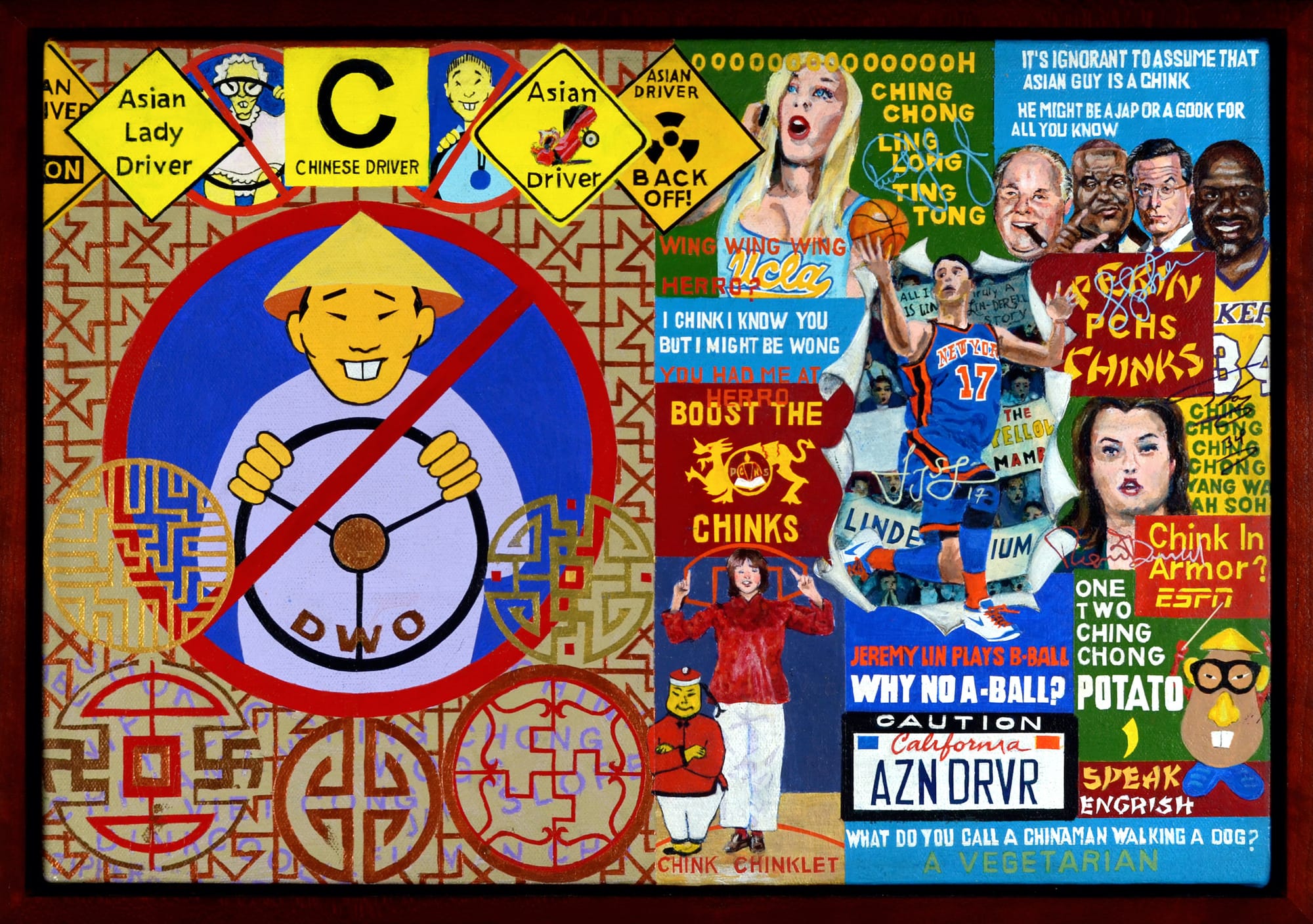 The motif of the frame is repeated in the scenes of everyday racism that border the lynching, underlining the connection between the two. It’s as if these “innocuous” symbols of racism — the Fu Manchu caricatures, the pulled eyes, the bad driving — are circling around the central image in a veiled threat, reminding the viewer of the very real possibility of violence at the core underlying it all.
